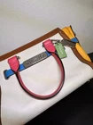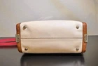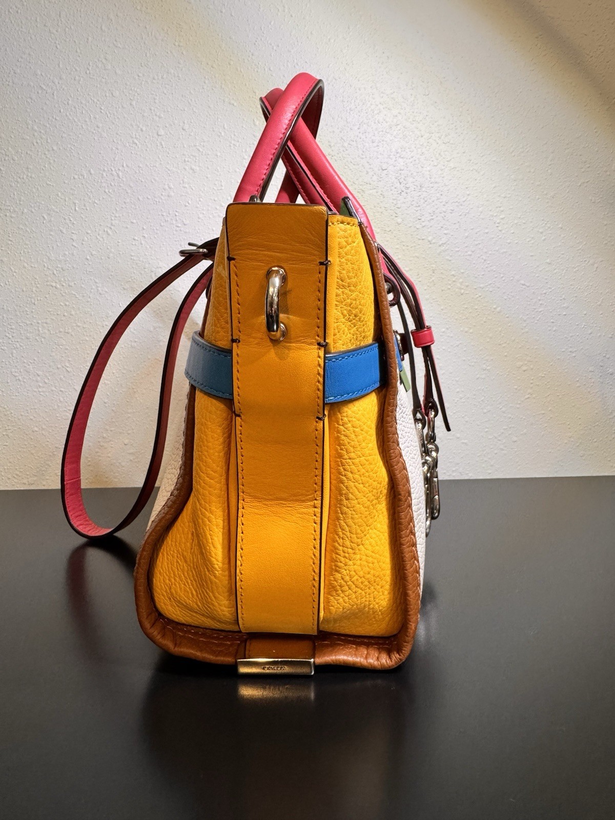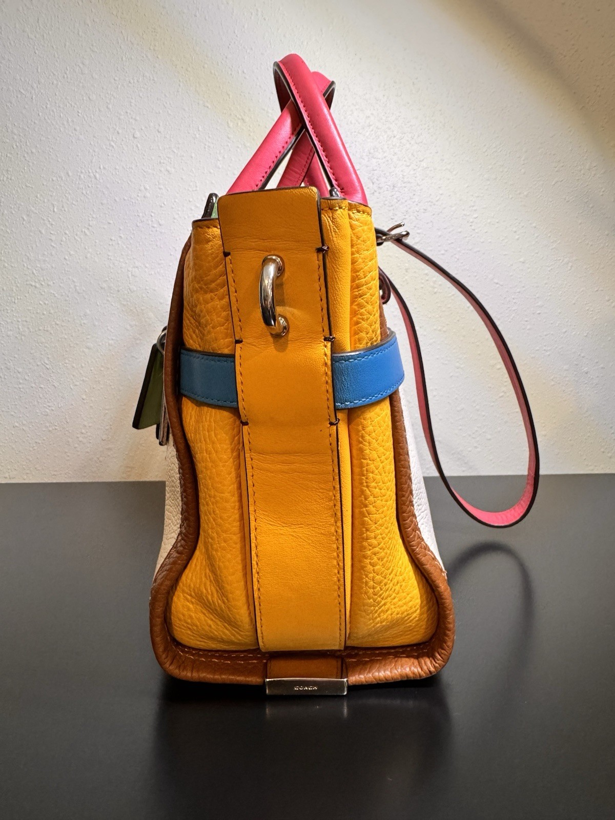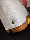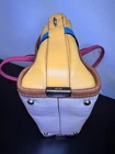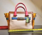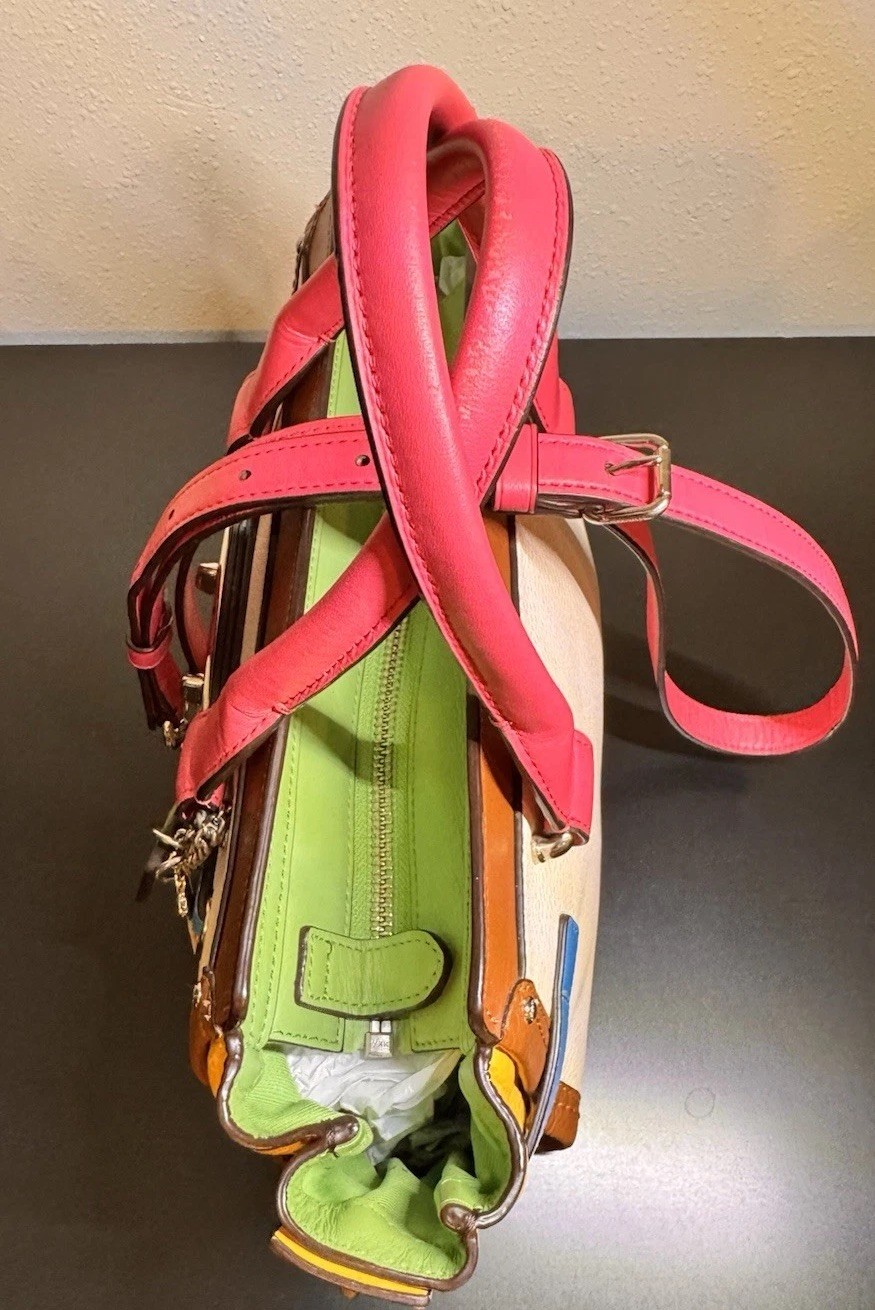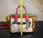 Overall excellent condition! Minor items to note: Scuff on bottom of bag (white part) and on side (yellow part), pen mark inside fabric under zipper flap (green part). Please see all pictures for further detail. Infused with vibrant summer color and trimmed with statement Coach hardware, this playful modern carryall comes finished with three separate compartments inside and a long detachable strap for crossbody wear. FEATURES: • Inside zip, cell phone and multifunction pockets • Zip-top closure, fabric lining • Handles with 4" drop • Longer strap with 19" drop for shoulder wear = 131/2" (W) x 53/4" (D) x 7 3/4" (H) • Leather • Silver hardware • double hang tag included - green & silver