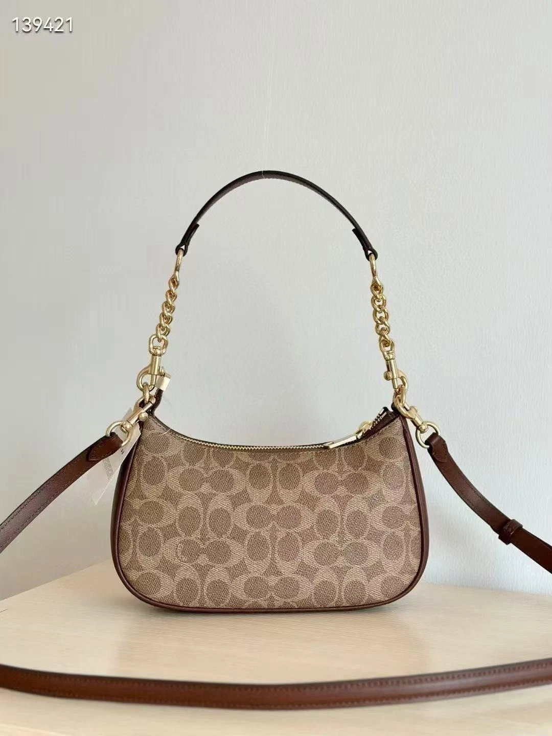 COACH Teri Shoulder Bag In Signature Canvas Gold/Tan/Brown Product Details Style Number CV933 Measurements Length: 9.5" Height: 6.0" Width: 3.0" Materials Signature coated canvas Fabric lining Handle Detachable handle with 8.5" drop Strap Detachable strap with 22.75" drop for shoulder or crossbody wear Features Inside multifunction pocket Two credit card slots Zip-top closure Our Teri Shoulder Bag has a '90s-inspired silhouette and comes in many shades to match your personal style. Crafted of Signature coated canvas, this designer shoulder bag for women can be worn two ways thanks to its detachable straps. This shoulder bag with chain strap features an interior multifunction pocket and two credit card slots for added organization. It comfortably fits your keys, wallet and phone without feeling weighed down. Finished with a zip-top closure, this bag keeps your essentials secure on the go. Wear it anywhere (and everywhere)—the Teri can be easily dressed up or down.