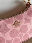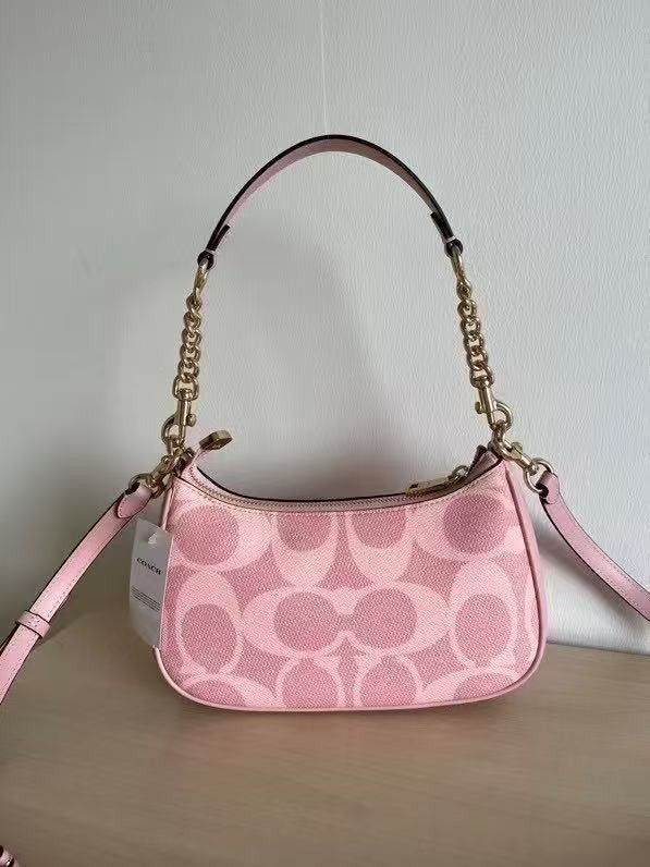 Teri Shoulder Bag In Signature Canvas Color: signature canvas/Gold/Powder Pink Style Number CAL51 Measurements Length: 9.5" Height: 6.0" Width: 3.0" Materials Signature coated canvas Fabric lining Handle Detachable handle with 8.5" drop Strap Detachable strap with 22.75" drop for shoulder or crossbody wear Features Inside multifunction pocket Zip-top closure