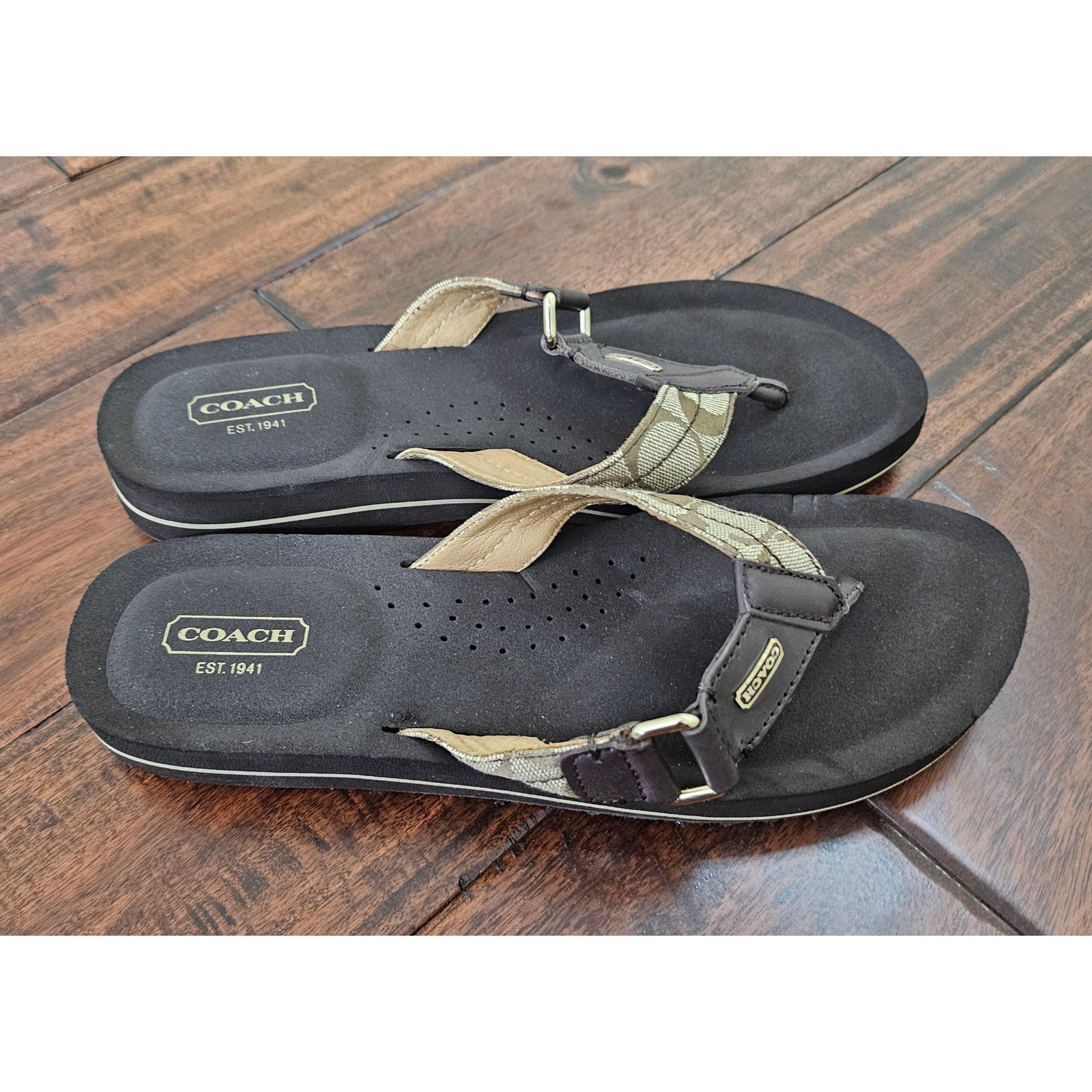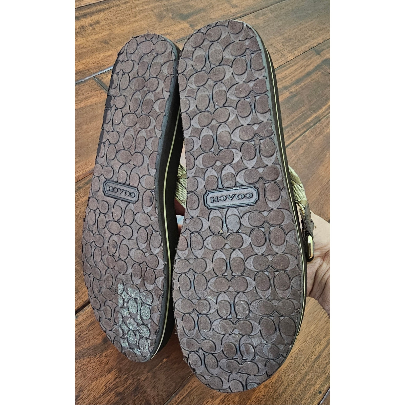 COACH Women's Flip Flops Wedge Thong Round Toe Brown Color Logo Print.Size 9.5B . Pre owned but great condition. Please view pictures.