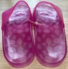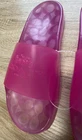 Bin P: The COACH Women's Ulyssa Water-Resistant Jelly Pool Slide Sandals in size 7B are stylish and practical footwear options for women. Featuring a slip-on closure and a flat heel design, these sandals are easy to wear and comfortable for all-day use. The bold pink color with logo accents adds a touch of signature Coach style, while the water-resistant feature makes them perfect for outdoor activities. Made with a rubber upper material, these sandals are durable and designed to last. Perfect for women who want both fashion and function in their footwear choices.