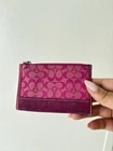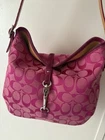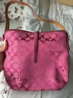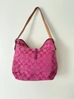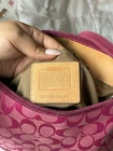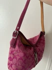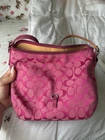 COACH Pink Hampton Shoulder Bag 2003 with matching wallet [Style# 6845] with original dust bag! -Signature Jacquard Fabric in Pink with C logo pattern -Suede lining on straps and some lining on the bag and wallet [Some stains, normal wear and tear. Please look at pictures before purchasing!!!] -Silver hardware with clip closure on the front of the bag -Clean interior and exterior [excludes suede material with minor wear and tear on both wallet and bag] !!! Please reach out if you need more pictures or have questions !!! FINAL SALE!!!