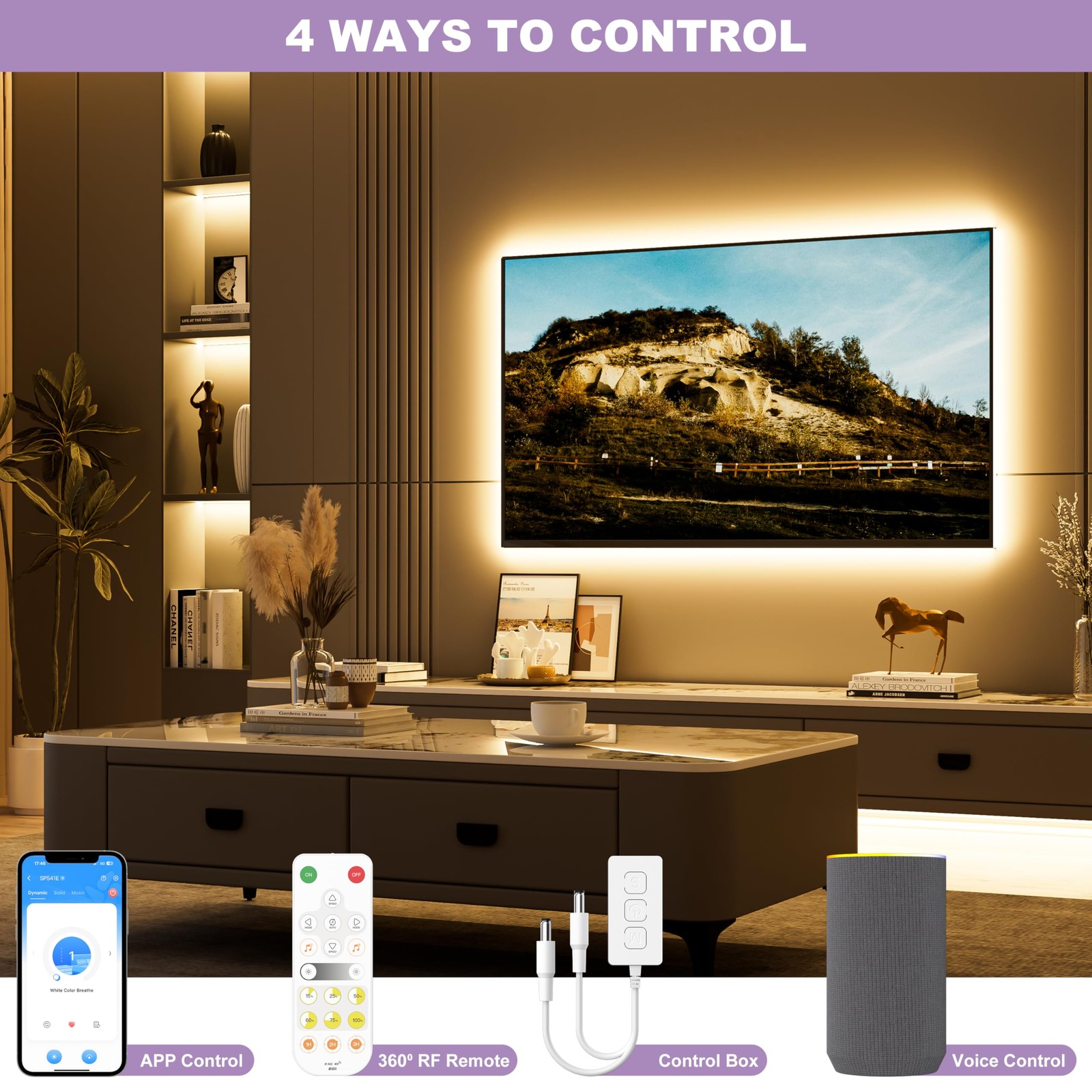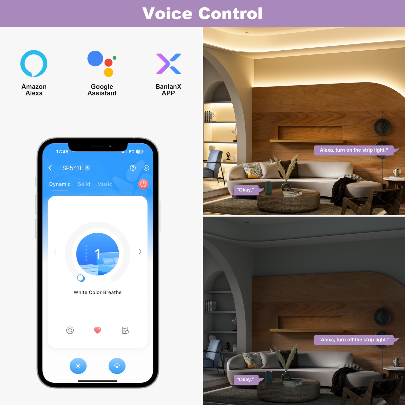 COB LED Strip Lights 65.6ft/20m,UL-Listed CRI 90+ Dimmable 3000K Warm White Super Bright,with APP Control/RF Remote,Work with Alexa/Google,for Home/Cabinet/Bedroom/Kitchen DIY Lighting Projects Super Long & High Lumen: 65.6ft (32.8ft×2) COB LED Strip Lights can decorate and color larger areas. This COB LED Strip Light has 6,400 lamp beads that provide lighting at the same time.Designed with chip-on-board (COB) LED technology, which integrates multiple LED chips into a single module for a more uniform lighting with no black dots. Compared with traditional SMD LED Strip Light, it adopts a 180-degree beam angle design and covers a wider area Voice Control: COB LED strip light is compatible with Alexa/Google Assistant. Waking up your LED strip lights with simple voice commands makes your operation more convenient.Find the Alexa/Google Assistant third-party voice platform in the "BanlanX" APP and follow the steps to connect.Once connected, it can be controlled by voice.Note: Please be sure to add the strip light to your "BanlanX" APP first (make sure the three icons next to the device are lit,only supports 2.4G Wi-Fi) Rich Functions: Supports multiple control methods! Built-in dynamic and static modes can meet the needs of multiple scenarios. Use the control box to switch and adjust the brightness.Even use the mobile APP, voice or RF remote control to control the strip lights from any angle (Remote control distance: within 15m/49.21ft in open area).Comes with various functions such as dimming,timer,music mode,memory function and group control Cuttable & DIY: COB LED strip lights are so flexible! Every 50mm/1.97in can be cut along the cut marks on the strip and reconnect the strips at these cut marks by soldering or using 8mm COB connectors (search for B0CLV3K3Z8).Comes with self-adhesive and can be applied directly to any dry, flat surface without the need for complicated tools or specialized skills. Superior flexibility allows you to get the perfect solution for your lighting project Wide Application: 90+ high CRI makes the color of the strip light have excellent reproducibility and are suitable for various indoor scenes like bedroom,living room,kitchen,wardrobe,stairs,corridor,under cabinet,dressing table,bookshelf,gym,yoga studio,etc.Whether for home decoration or commercial display, our products can meet your needs Safety & Long Lifespan:COB LED strip light has UL-Listed and 24V low voltage,which is safer to use! Every detail has been carefully designed and rigorously tested to ensure high quality and excellent performance. Real double-layer PCB and advanced materials make it be a long lifespan of 65,000 hours