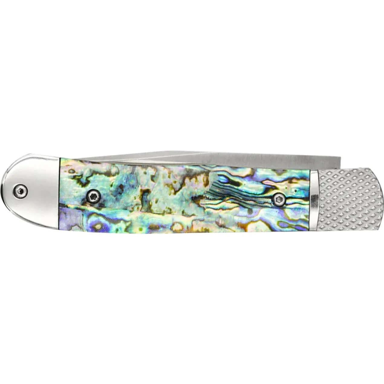Introducing the extraordinary Trapper Hidden Release Abalone Knife, a masterpiece that seamlessly blends elegance and functionality. This exquisite knife features a unique hidden release mechanism ingeniously within its bolster, ensuring a sleek and unobtrusive appearance. Crafted with unparalleled precision, this Trapper Hidden Release Knife is the epitome of sophistication. The handle of this remarkable knife is adorned with lustrous abalone scales, creating an enchanting kaleidoscope of iridescent hues that catch the light with every movement. The natural beauty of abalone makes each knife a one-of-a-kind work of art, showcasing the captivating patterns and colors found in these ocean gems. The Trapper Hidden Release Abalone Knife boasts a razor-sharp blade made from premium 154CM stainless steel. Renowned for its exceptional edge retention and corrosion resistance, the 154CM blade guarantees a reliable cutting experience, whether for everyday tasks or specialized use. Its versatility makes it a preferred choice among professionals and enthusiasts alike. The hidden release mechanism, nestled seamlessly within the bolster, adds an air of mystique to the knife. The bolster itself is exquisitely designed, providing a secure grip and enhancing the knife's overall appeal. The hidden release feature allows for swift and effortless deployment of the blade, making it perfect for those seeking quick and discreet access to their tool. Whether you're a collector of fine knives or an adventurer who values a dependable companion, the Trapper Hidden Release Knife with its abalone handle and 154CM blade is sure to captivate your senses and elevate your cutting experience to an unparalleled level. It is a symbol of artistry, craftsmanship, and practicality, making it an exceptional addition to any knife enthusiast's collection.