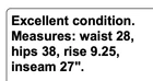 Excellent condition. Measures: waist 28, hips 38, rise 9.25, inseam 27". THANK YOU EBAY!!! We are so thankful for our customers! We have thousands of listings, and therefore receive hundreds of messages, every single day. So, if you are asking about a price drop, or a shipping price drop, or asking for extra measurements, or to add additional photos, please allow me to answer you here, No thanks. If your question is not one of those questions, we will be happy to answer you individually. YES...WE DO COMBINE DOMESTIC SHIPPING. Extra jewelry items ship for $2 each (except for large jewelry lots). We will refund the difference as we are mailing out.....we hope you enjoy shopping with us! We encourage you to read the description and check all photos.