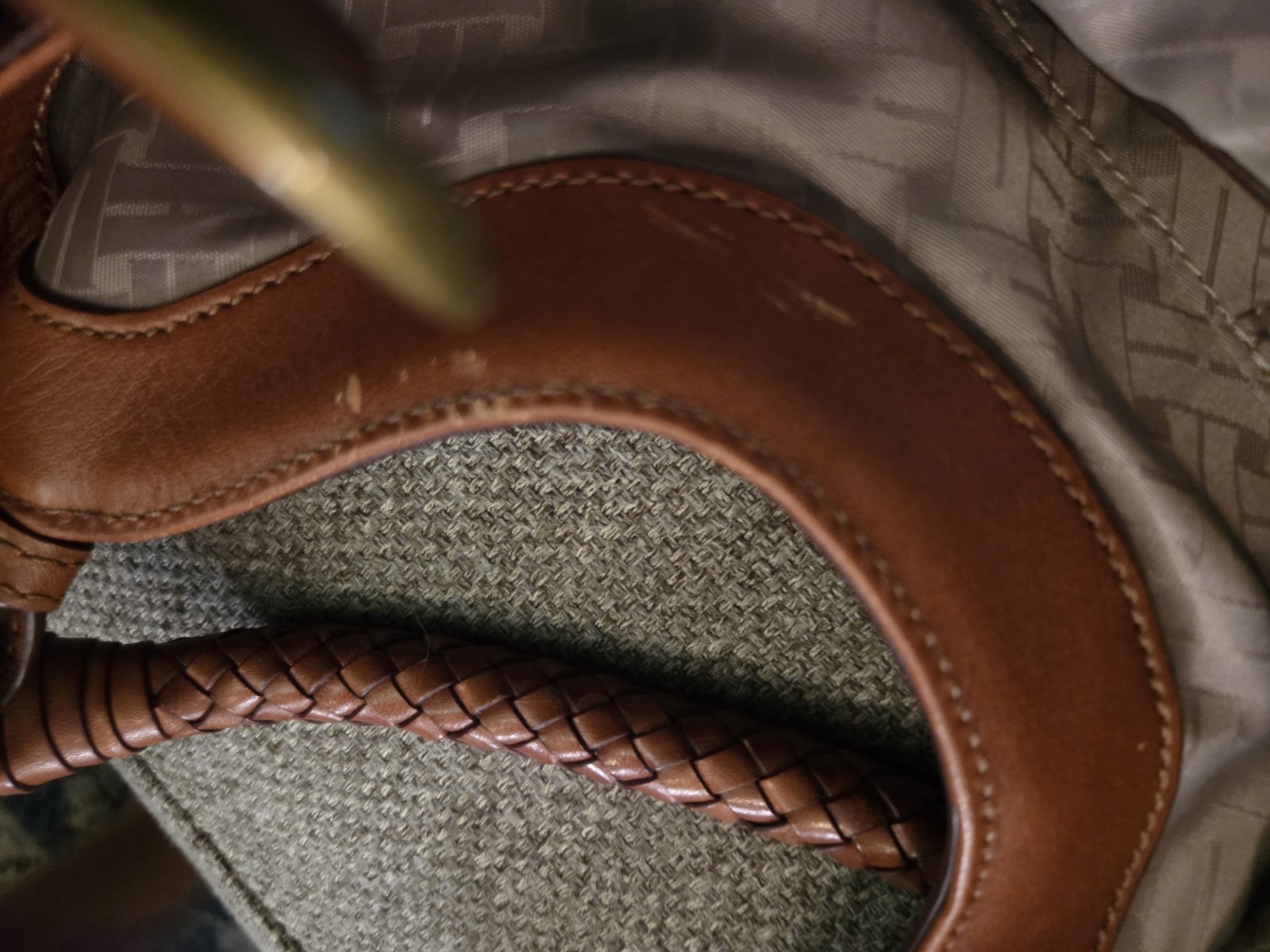 COLE HAAN Genevieve Weave Large Triangle Tote Hobo Woven Bag Purse Used From pet free smoke free home. Has a stain on the bottom as seen in the last picture. Has some very light scratches as seen in pictures 4, 5 , and 6.