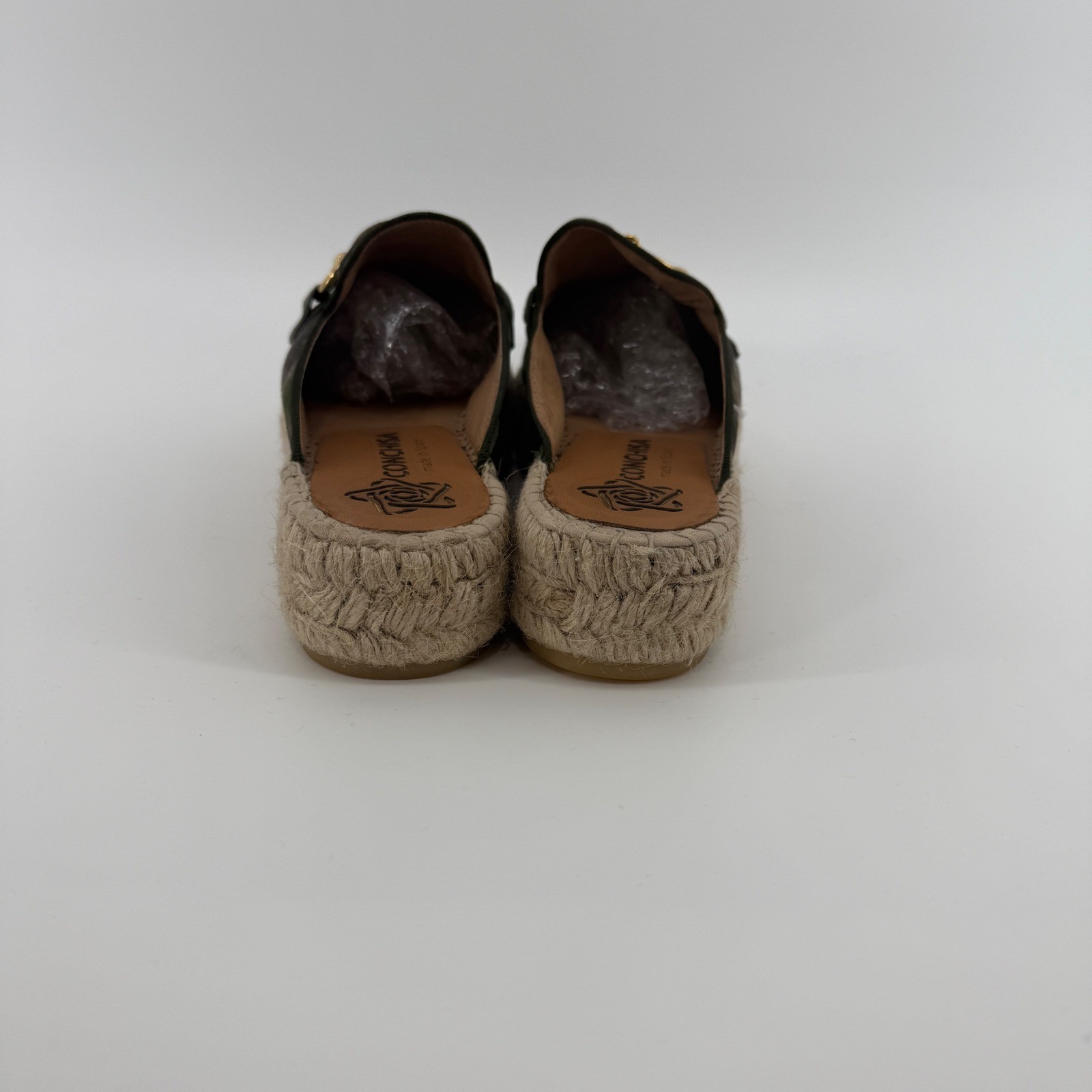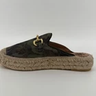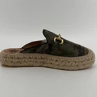 Style: Slide Department: Women Upper Material: Suede Features: Padded Occasion: Casual Theme: Equestrian Insole Material: Leather Lining Material: Leather Outsole Material: Rubber EU Shoe Size: 38 Type: Flat Closure: Slip On Toe Shape: Closed Toe Pattern: Camouflage Shoe Width: Standard Fabric Type: Canvas Keywords: camouflage print, slip on mules, espadrille sole, gold hardware, designer inspired, summer shoes, casual flats, artisanal, Spanish footwear, metallic accents, European style, outdoor shoes, fashion sneakers