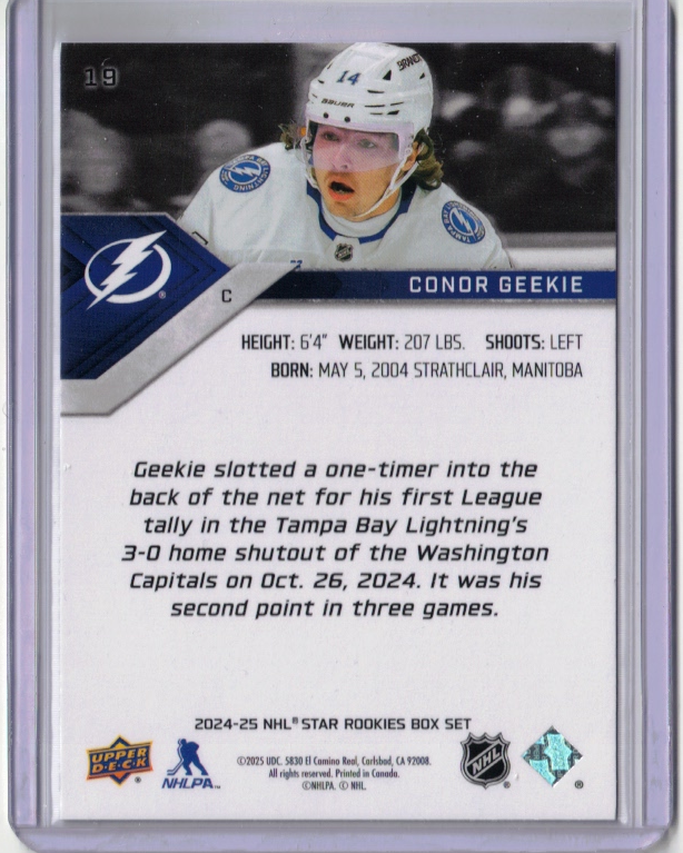 You are bidding on a 2024/2025 Upper Deck Hockey Card. #19 CONOR GEEKIE STAR ROOKIES BOX SET ROOKIE CARD Many other listings available: Upper Deck Young Guns, Jersey Cards, Auto Cards, ITG, Leaf and OPC listings for combined shipping discounts. Card is near mint or better condition as condition is subjective and will be securely shipped in Cardboard Supported Top Loader and Team Bag. $2.99 shipping in Canada and the US or $5.99 to International. ***PLEASE NOTE*** Mail going to the US must now go in PWE (Plain White Envelope) to qualify as letter-post, otherwise it must be upgraded to Tracked/Insured shipping at a cost of $12.99. You can thank USPS for this, as they now require anything in a Bubble Mailer to go by electronic form and will not allow it as letter-post anymore. It will cost more for Registered Insured Shipping (with tracking), if preferred please request prior to payment at a cost of $12.99 (USA & Canada). Please check out my other listings, I will also combine shipping on multiple items (Over 8000 other listings!), the cost will be a very low $0.25 for each additional item on combined payment (Please wait for invoice, sets excluded). In order to receive combined shipping discounts payments must be combined, if uncombined payments are sent, they cannot be retroactively refunded as fees are assessed on each payment. All items should be paid for within 7 days of the end of auction. THANK YOU FOR BIDDING, GOOD LUCK and ALL THE BEST!