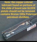 The perfect gift for the one who has everything GLOCK. Sure will be a surprise! "The copper colored lubricant found on portions of the slide and trigger connector should not be removed...After cleaning...Apply the copper colored lubricant to portions of the frame, slide and trigger connector..."-Glock Inc 2003 GLOCK COPPER GUN GREASE: Enhance the performance of your GLOCK pistol with this high-performance lubricant. The Bronze Oilite brand offers a saltwaterproof and heavy-duty lubricant that is perfect for all caliber GLOCK pistols. The 10.0ml unit comes with a syringe for easy application. This lubricant is designed to ensure smooth operation and prevent wear and tear on your GLOCK pistol. It is made of high-quality bronze copper material and contains a copper-colored lubricant that is perfect for enhancing the aesthetic appeal of your pistol. The item weighs only 10.0ml and is manufactured in the United States. Get your hands on this premium quality lubricant and take the first step towards maintaining the optimal performance of your GLOCK pistol. GLOCK The spirit of the age is to make you forget. To forget the genius of Gaston Glock. To not remember the copper colored lubricant found on portions on the inside of new glock pistols. To not remember the instructions of "Should Not Be Removed " To not remember the Glock endurance test of one million rounds fired from a single pistol. COPPER COLORED LUBRICANT The same anti-friction, anti-seize, high temperature, water resistant, no run, copper grease found in a brand new Glock off the assembly line. When you buy a new Glock, you are NOT supposed to clean off the Bronze Oilite copper grease. You are supposed to let it protect against wear and friction over time by itself. This special Bronze Oilite grease serves two important purposes. First, it works as an anti-friction agent as you break in your gun. Bronze Copper is a much softer metal than steel and the polarized petroleum distillate grease is a lot thicker than basic gun grease, these two factors give more protection than standard gun grease for parts with steel on steel contact that take lots of abuse. The second reason Glock applies this is because when they make a new gun, there is no way to know how long it may sit on the shelf before it is sold. This Bronze Oilite anti-seize is ideal for long-term storage. Will not run like typical gun grease or gun oil. This anti-corrosion grease can also be used in place of regular gun grease to protect your springs and magazine spring to keep moisture from rusting them up. Bronze Oilite lubrication can also be used in other firearms as well. Just a dab of this at a time because a little of this copper colored lubricant goes a long way. Place a small drop on the rails and some other metal on metal contact areas or anywhere else you would use traditional gun grease. The spirit of the age is to forget the Glock endurance test of 1 million rounds fired from a single Glock 17 with only this proven superior copper colored lubricant inside. Without breaking a single part and only replacing worn magazines. Unmatched performance from a single pistol, with credit going to the copper colored lubrication that no other wet oil or gun grease can provide. ◇ Glock endurance tested 1 million rounds fired from a single pistol* Anti-friction...IMPORTANT INSTRUCTIONS: DO NOT DILUTE. The Bronze Oilite ball bearings are designed to attach to the pores of the steel and rotate freely in the Polarized petroleum distillates. ◇*08-02-2010 | 12:44 PM SJgunguy24 *The old National Shooting Club in Santa Clara had a G 17 that had 1,000,000 rounds. The Glock factory purchased back that pistol for testing. My 17 is close to 5