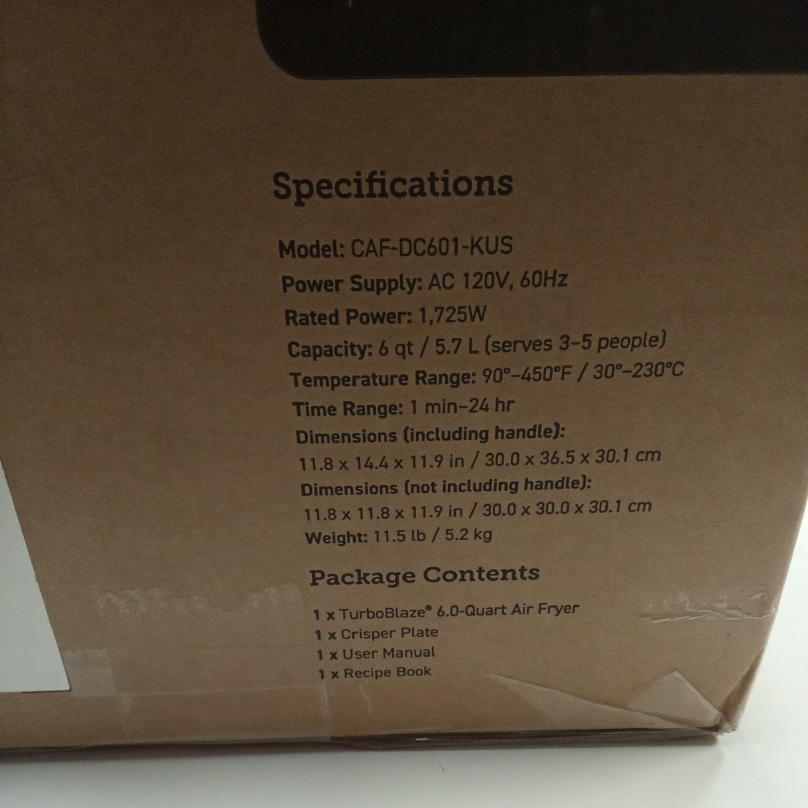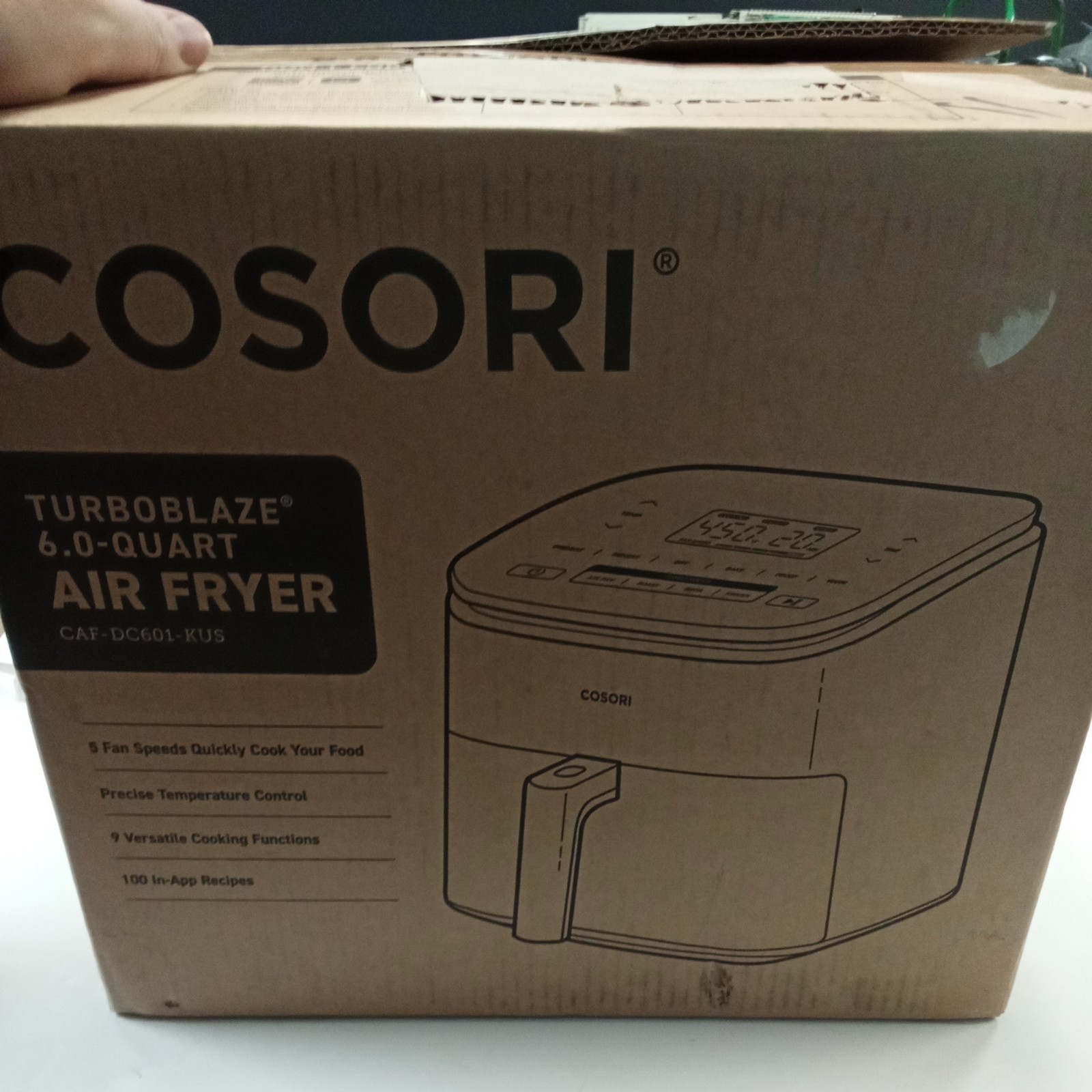 item is brand new and in box. box has a coupe spots where first layer of cardboard was removed as seen in photos. If you have any questions please feel free to ask before purchasing as I am happy to help. The COSORI Air Fryer 9-in-1 is a compact and large 6-Qt air fryer that offers fast turbo modes and precise temperature control ranging from 90-450°F. With a maximum timer setting of 60 minutes and a minimum temperature of 170°F, it allows for versatile cooking options. This digital display and easy-clean air fryer from Cosori features nine settings/programs, making it suitable for a variety of dishes. Made with a non-stick surface and powered by electricity, this sleek black air fryer is a convenient addition to any kitchen.