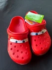 The product is a Lightning McQueen limited edition Crocs sandals, perfect for fans of the Cars movie. These red slip-on sandals feature the iconic Lightning McQueen logo as accents, making them a stylish choice for casual occasions. With a rubber outsole and insole, these Crocs are comfortable for all-day wear during the summer, fall, and spring seasons. Fast shipping ensures that you can enjoy these unique and collectible sandals in no time. NOTE NO LIGHT UP.