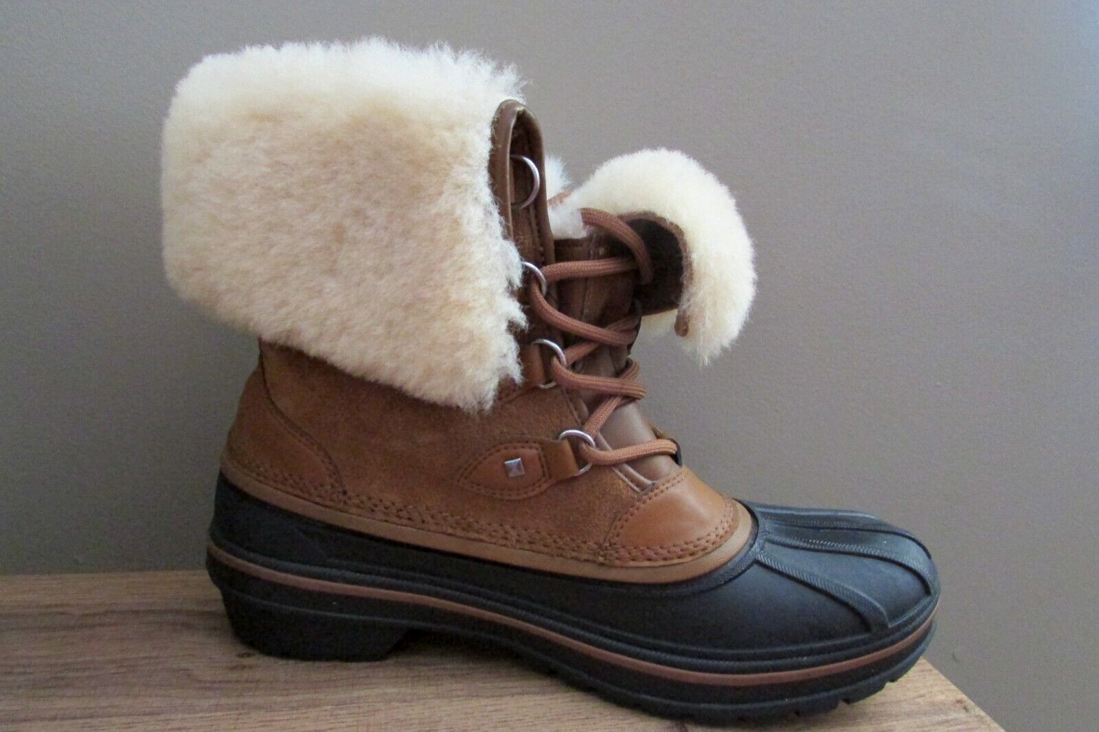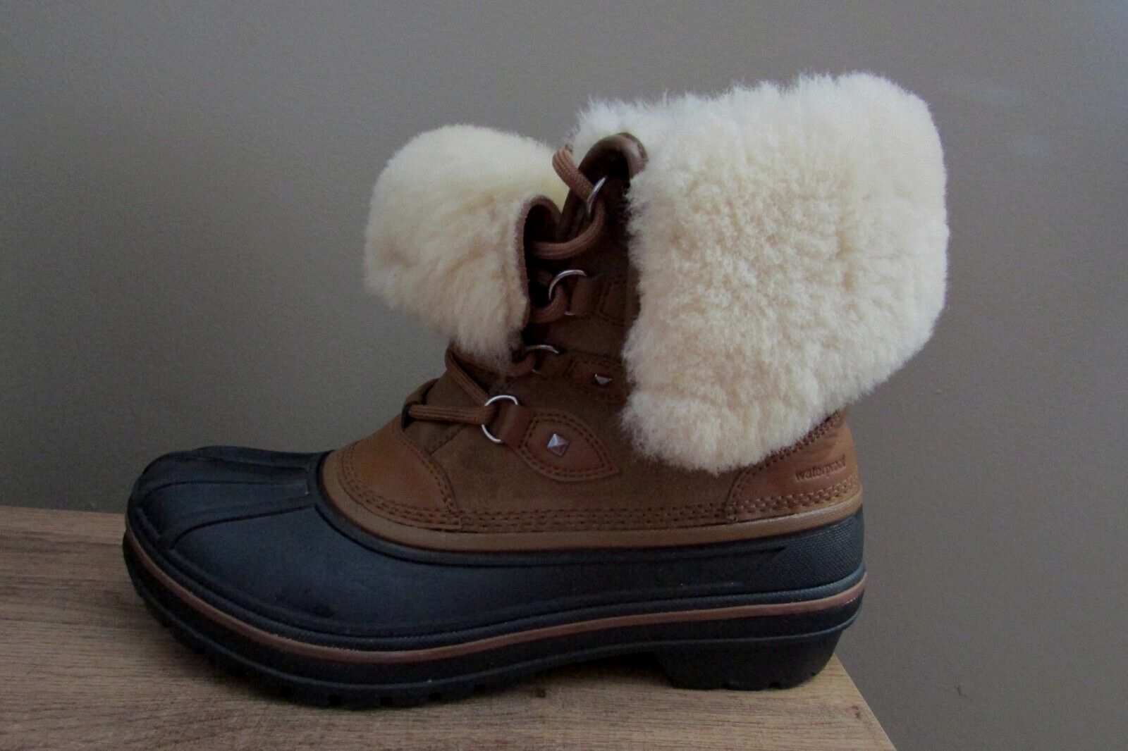 DISCONTINUED HARD TO FIND ALL-CAST 2 LUXE LEATHER WATERPROOF SNOW BOOTS IN WHEAT / BLACK IN WOMEN 8. Enjoy an extra layer of luxury fuzz around the upper shaft of your boots! These are WATERPROOF Crocs snow boots. worn once great condition smoke and pet free home