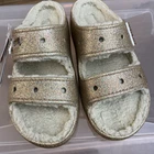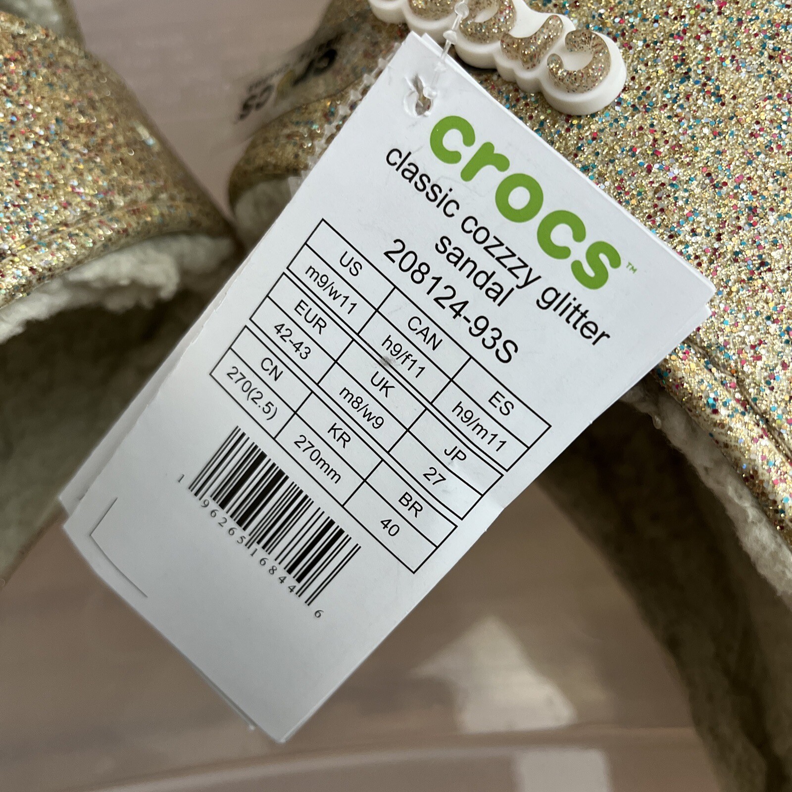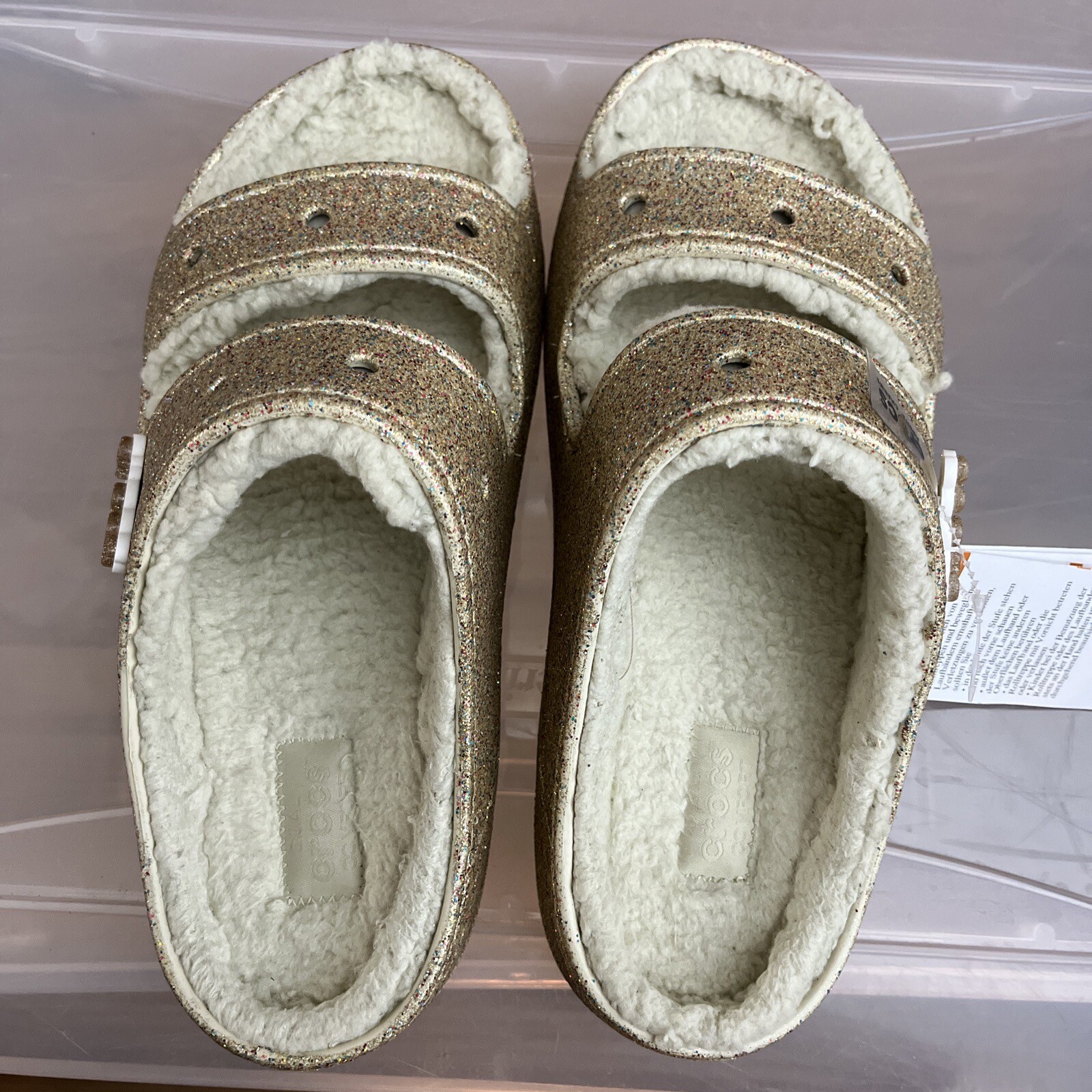 Brand new Crocs Classic Cozzzy Glitter Sandal 208124-93S. Gold glittery. Size Women’s 11 or Men’s 9. Slides style that hold Crocs Charms. From a smoke-free home.
