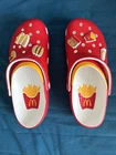 Step into the limited edition Crocs X McDonald's Branded Classic Clog Shoes, featuring a vibrant red and multi-color design with the iconic McDonald's logo. These slip-on sneakers are perfect for walking, hitting the beach, or school activities. The UK shoe size is M10/W11, while the US shoe size is m11 and the EU shoe size is 45-46. These Crocs are part of the CROCS X MCDONALD'S BRANDED CLASSIC CLOG SHOES product line and were manufactured in China. They come with a style code of 209858-90H and are not customized or signed. Get your hands on these branded clogs and show off your style!