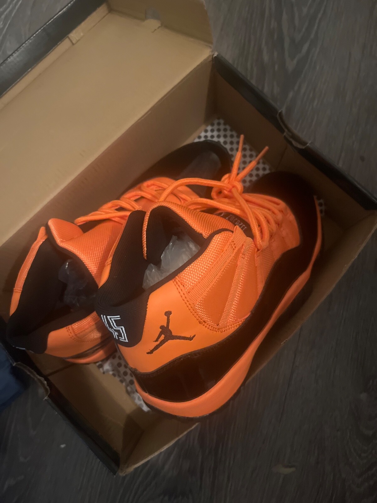 CT8012-800 Nike Air Jordan 11 Black and Orange men's basketball shoes. Condition is New with box. Shipped with FedEx Ground or FedEx Home Delivery.