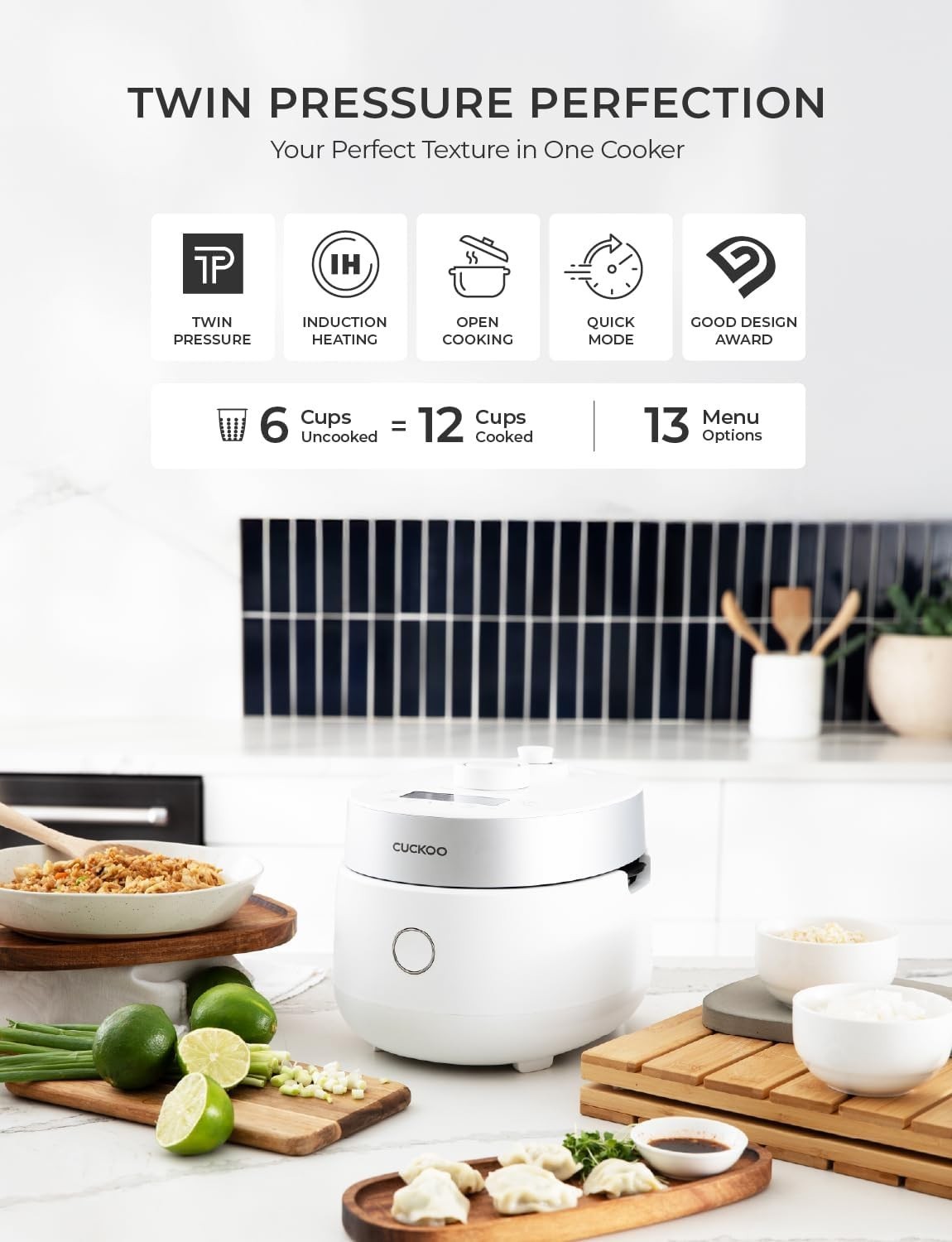 Brand CUCKOO Capacity 3 Cups Product Dimensions 14"D x 9"W x 10"H Power Source Corded Electric Product Care Instructions Hand Wash About this item 15 Versatile Modes: With 15 menu options including GABA/brown rice, glutinous/white rice, scorched rice, high-pressure steam, or stored rice Small to Mid Capacity: The 3-cup uncooked (6-cup cooked) capacity makes this rice cooker ideal for small family gatherings to everyday dinners Induction Heating: Induction technology heating surrounds the inner pot, making cooking quicker and more efficient Dual Cooking Pressure Selections: Choose between high-pressure and non-pressure cooking for sticky or fluffy rice Included Accessories: Comes with a product manual, rice spatula, and rice measuring cup
