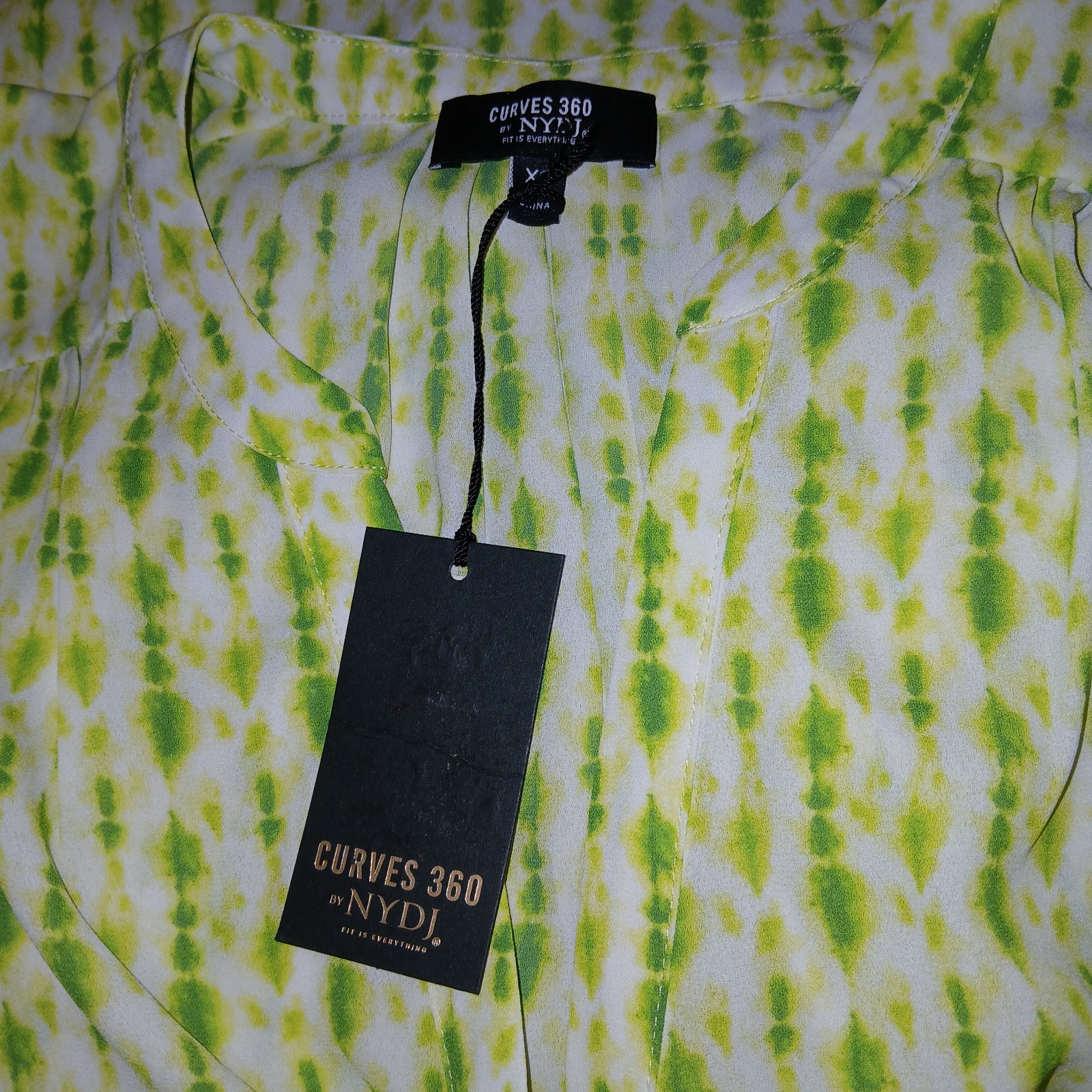 THIS IS A CUTE CURVES 360 BY NYDJ LADIES SLEEVELESS SEMI-SHEER BUTTON TOP IN A SIZE XS. IT IS NEW, WITH TAGS AND PRICE TAG OF $79. LIGHT GATHERS JUST BELOW FRONT SHOULDER SEAM V-NECK BUTTON PLACKET PULLOVER KEYLIME COLOR GEOMETRIC PATTERN MACHINE WASH DRY 100% POLYESTER NARROW PLEATS IN BACK NECK CHEST: 42" WAIST: 41" ROUNDED AT LOWER EDGE TO SEAMS SMOKE-FREE/PET-FREE HOME SHIPPING: GROUND ADVANTAGE USA/FIRST CLASS INTERNATIONAL 5 OZ. THANKS FOR LOOKING! Visit my store, DJ's Closet!