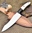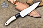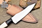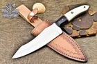 Custom Hand Made D2 STEEL KITCHEN CHEF KNIFE WITH BONE HANDLE We offer a shipping discount for More then one purchased . And discount will be apply on combine invoice, Discount will not apply on separate payment. ITEM DETAILS OVER ALL LENGTH 14.0 inches long (Approx) HANDLE LENGTH 5.0 inches long (Approx) BLADE LENGTH 9.0 inches long (Approx) BLADE HARDNESS 58-60 HRC Which Holds The Sharp Edge For Long Time. HANDLE BONE COVER LEATHER SHEATH This Awesome custom made KNIFE has a nice hand forged with the combination of 4340 & 1080 steel. HOW OUR DAMASCUS IS MADE: All our Damascus is real and not just an acid etch. Damascus is a mixture of 1080HC and 4340 nickel carbon. You heat them up together and then fold the bar over and over to get the desired layers, ours are 396 layers. Then you burn the blade in acid, and it turns the nickel satin color and the high carbon turns blackish gray. This is how the layers are exposed to show the layers of the new steel created coined "Damascus". All Damascus is acid etched to show the layers. If you high polish the metal it will be shinny satin like all steels. Only after you burn the sides of the blade with acid do you see the layers of the two steels. Makes sense? After we make our knives we high polish the handles and put an edge on the blade. The high polishing buffs off the acid burned layer of the handle, and the blade edge is sharpened and the acid burned edge becomes satin. You can re-burn the tang of the blade near the handles and the edge of the blade and it will show the layers once more. All our knives are hand made, durable and unique ***** YOU WILL RECEIVED THE SAME KNIFE Qality Standards Our Damascus blades are made from high quality non-stainless steels which rival or exceed any Damascus blade made from the 10 series with 4340. Our Damascus combination has taken years to perfect and has been tested under a variety of application which will offer professional performance in categories of toughness, strength (lateral stress) and edge honing and holding ability. In a 5 spot Rockwell test our blades will average near or close to 58 which offers a perfect balances between its toughness and strength.Our blades due to carbon content need to be regularly treated with wax and/or 3 in 1 oil to maintain its superior quality. Questions if you have any question feel free to send us message we aim to answer all questions within 24 hours Feedback If you are not satisfied with our service please contact us before leaving any negative or natural feedback. We will resolve all issues as quickly as possible. Disclaimer We are not responsible for any injuries associated with the use of our tools. Our products are intended for legal use only by responsible buyers. Therefore, we will not sell our products to anyone under the age of 18. Before bidding please check your country laws as some countries Custom don't allow this. If your purchase is held by Custom Authorities in your country/State we will not be responsible for that and no refund will be issued Shipping We offer a 20% shipping discount for More then one purchased . And discount will be apply on combine invoice, Discount will not apply on separate payment We ship within 24 hours after receiving complete payment but this can be delayed due to week ends or Governments and Religious Festivals . . This is beyond our control and we apologize for this inconvenience. Precautions Our Tools are very sharp so open and use them very carefully We are not responsible for any injuries associated with the use of our tools Tips to Care knife 1. NEVER STORE YOUR KNIFE FOR LONG TIME IN LEATHER SHEATH. 2. LEATHER CAN ABSORB WATER, WHICH WILL RUST THE KNIFE. 3. ALWAYS CLEAN THE BLADE AFTER USING WITH OIL OR WAX