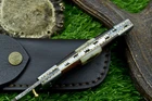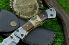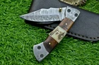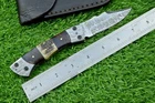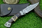 CUSTOM HANDMADE DAMASCUS POCKET FOLDING KNIFE, POCKET KNIFE, LEATHER SHEATH, LINER LOCK MEASUREMENTS / SPECIFICATIONS: Knives Overall Length: 7.50" ( Approx.) (When Opened) Blade Thickness: Approximately 4 mm Blade Material : Damascus Steel Handle Material : Natural wood and ram horn scales fastened with brass pins with handmade DAMASCUS bolster. Excellent File work Pocket Knife Description: Introducing an extraordinary Liner-Lock pocket knife, masterfully handcrafted. This folding knife features a sturdy 3mm-thick blade, meticulously crafted from premium Damascus steel. The captivating Damascus patterns on the blade are the result of the intricate process of hammer folding and forge welding high and low carbon steels (1095 & 15N20). The blade is equipped with a finely sharpened edge and a convenient Thumb Stud for easy opening and closing. Additionally, both the blade's spine and the handle are adorned with exquisite file work. Damascus : Damascus is a mixture of 1095 and 15N20, they are heated and then folded over and over to get the desired layers. The blade is burned in acid and it turns the layers into different colors. The layering process also results in a blade that is harder and durable than a single type of steel. Size Verification: To help you easily determine the size, we've included images with a scale for precise dimension reference. Thank you for your understanding. We appreciate your consideration. Please note to all buyers: I have more than one piece in stock, so the knife blade pattern and sheath you receive might slightly vary from the ones shown in the pictures. Thank you. FOR INTERNATIONAL CUSTOMERS: Please verify your country's import laws before making a purchase. If customs authorities in your country or state hold your order and request custom duties, you are responsible for paying these fees. We are not accountable for customs-related issues, and refunds will not be issued under these circumstances. The Art of Crafting Damascus Steel: At our workshop, we are passionate about creating genuine Damascus steel knives. Here’s a look at our detailed process: Material Selection: We carefully choose a combination of 1095HC and 15N20 nickel carbon steel. Layering: The metals are heated and folded numerous times to achieve an impressive 384 layers. Acid Treatment: The blade undergoes an acid treatment, which highlights the satin finish of the nickel and the dark hue of the high carbon steel, revealing the intricate Damascus pattern. Blade Finishing: The edge is sharpened to perfection, emphasizing the detailed layers and resulting in a stunning satin finish. Our commitment to authentic Damascus steel craftsmanship ensures each knife is not only beautiful but also highly functional. AGE RESTRICTION: We do not sell knives to anyone under the age of 18. Shipping from Pakistan / USA Features and Additional Details: Leather Sheath (if included): Each knife comes with a premium, thick leather sheath. Expertly hand-tooled and sewn, this sheath is designed for durability and can endure years of use. Extra stitching adds to its longevity, making it a reliable companion for your knife. Care and Maintenance: To keep your knife in top condition, use a Diamond Wet Stone for sharpening at a 20-degree angle. After use, wash the blade with soap and water, dry thoroughly, apply gun oil, and store it away from the leather sheath. Leather can absorb moisture, which may cause rust if the blade is stored improperly. Feedback Your satisfaction and our eBay reputation are very important to us. We greatly appreciate your positive feedback! When rating shipping time, please consider international transit times. Your positive feedback motivates us to improve and serve you better. If you encounter any issues with your order, please contact us first. Avoid leaving neutral or negative feedback before we have the chance to resolve your concerns. We are dedicated to ensuring your satisfaction. Payments & Returns: We accept all standard eBay payment methods. Items are returnable according to our 14-day return policy. Shipping and Handling: We offer free shipping on all products. Tracking Information: Tracking numbers will be sent via email when available. You can also track your order through the "Order Details" section on eBay. DHL updates tracking information daily if available. Contact: Feel free to message us via eBay at any time. We are committed to responding within 24 hours and providing excellent customer support.