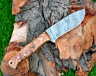 CUSTOM MADE HAND FORGED DAMASCUS STEEL SKINNER KNIFE HUNTING CAMPIN SURVIVAL HIKING KNIFE Wood Handle This superb design knife is hand forged. Blade of this knife has a nice file work and is made of 512 layers of 4340 stainless steel and 1075 high carbon steel and hardness 55-58 HRC . This robust knife is lab tested under intense conditions, the balance and shape of this knife ensures perfect grip. Overall Length: 9" Inches Blade Length: 5" Inches Handle Length: 4" Inches Damascus Design: Rain Drop Pattern Layers: 512 Hardness: 55-58 HRC Package Includes: with Leather Sheath Warning: Keep fingers clear of blades. Store away from children.