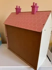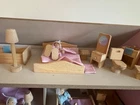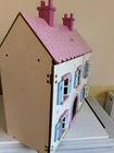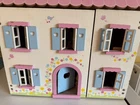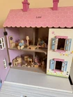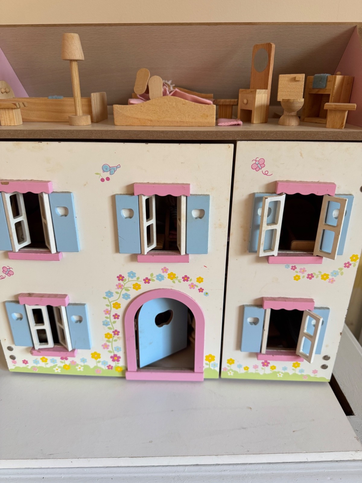 This is a really cute wooden dolls house over 3 floors. Lots of wooden furniture and room sets as pictured. 4 dolls also included. Beds washing machine sofa pets etc Generally good played with condition. A sticker has been removed from side which can be covered up with another one and you might need one for name. on roof Not too large - measures 44 cm high 20 cm deep 45 cm wide approx