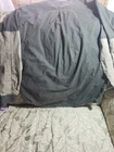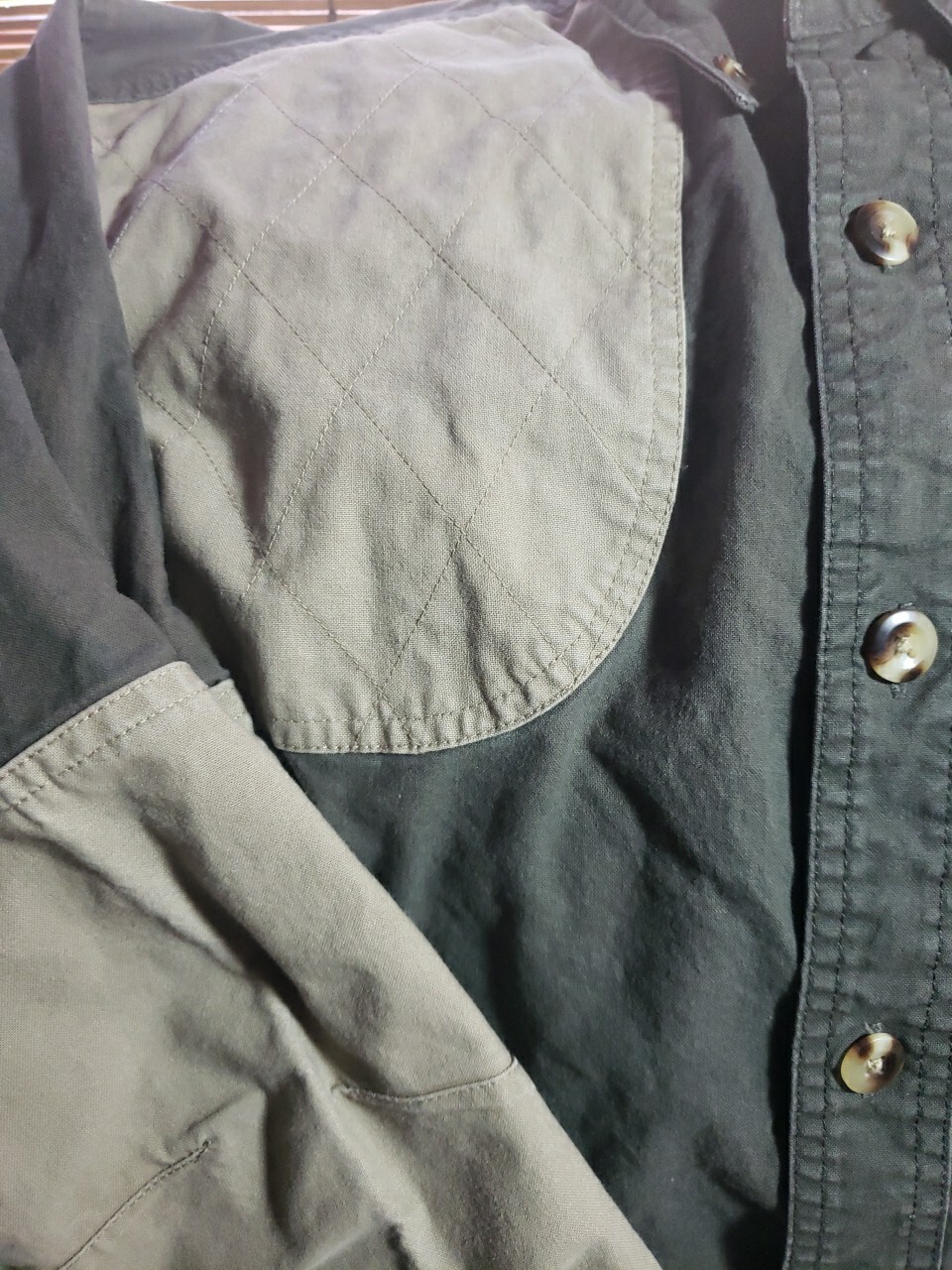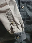 This is a Cabela's men's shooting shirt in size Medium, featuring a collared neckline, long sleeves, and a button-down closure. The shirt is made of cotton canvas in a solid green color with beige quilted accents and a padded design. It is suitable for casual occasions and all seasons, designed for outdoor activities. The shirt is part of the Cabela's Outdoor Gear product line and has a classic button-down collar style.