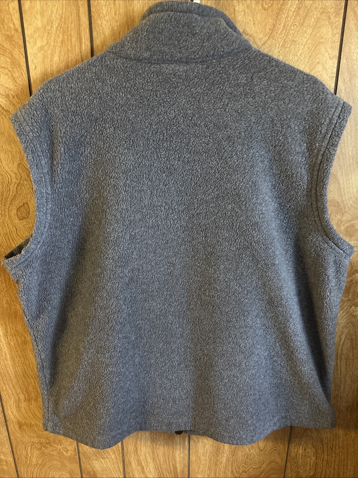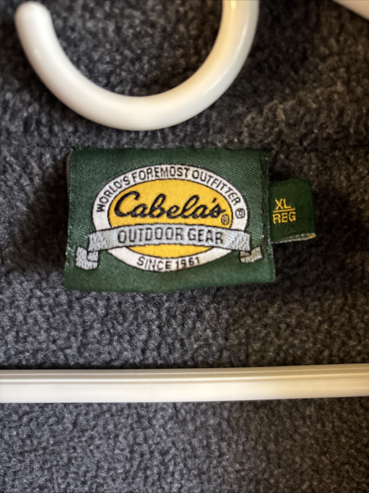 This Cabela's Fleece Vest is designed for men in size XL, featuring a sleeveless mock neck and a full zip closure in a versatile gray color. Made of polyester fleece, this mid-length vest is adorned with zipped pockets and the Cabela's logo as accents. With a classic fit and all-season suitability, it is ideal for casual or business occasions, offering comfort and functionality for activities like golf, skiing, hiking, and more.