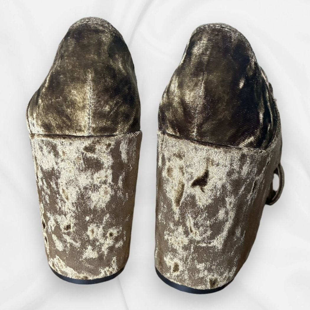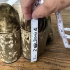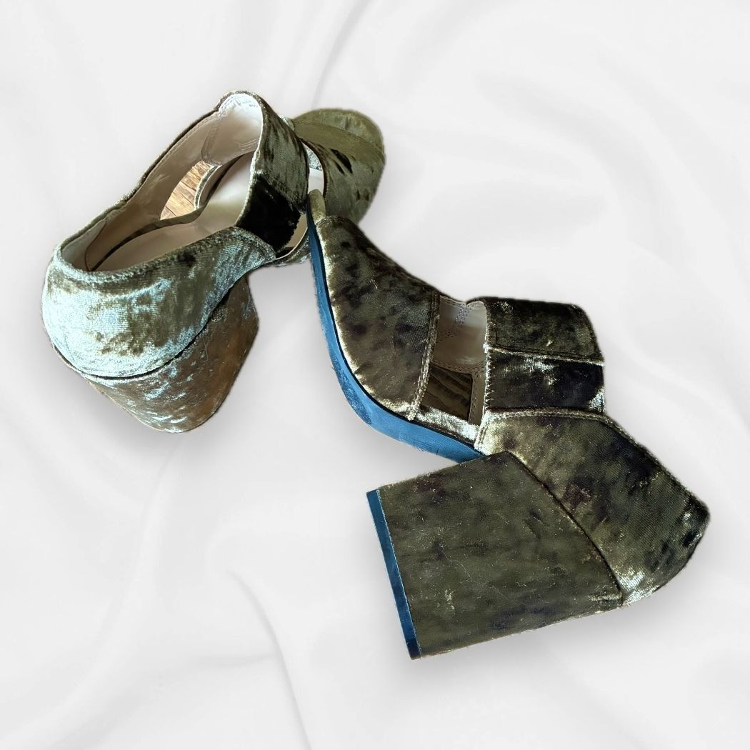 Crafted with a luxurious crushed velvet finish, these olive green sandals feature a high block heel and open-toe design. The intersecting straps add a touch of sophistication, while the sturdy heel ensures comfort and stability. Perfect for elevating formal or semi-formal attire with a touch of elegance. • Luxurious Crushed Velvet Upper • Open-Toe Design For Breathability • Intersecting Straps For Secure Fit • High Block Heel Measuring Approx. 4 Inches • Durable Non-Slip Sole • Size 7 Fit