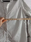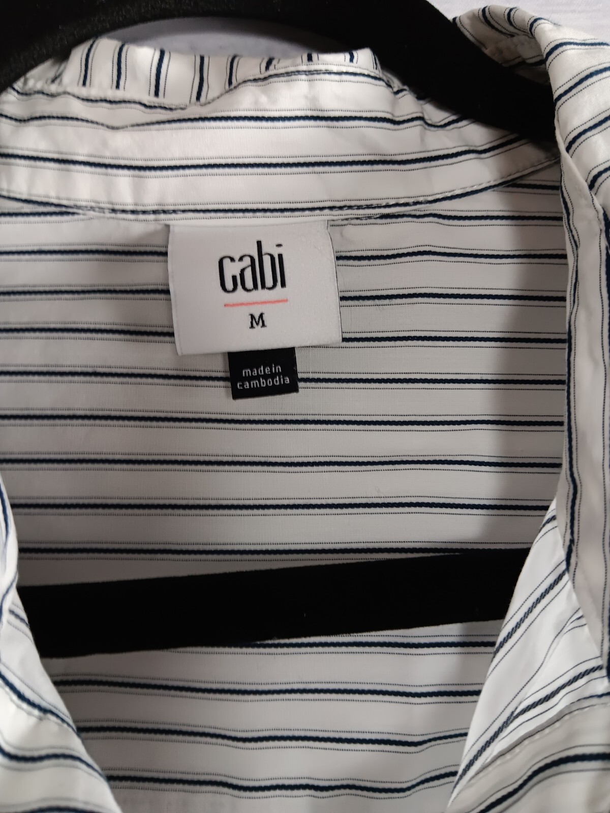 This Cabi shirt is designed for women in size Medium with a striped pattern in white and black. It features long sleeves, a collared neckline, and a button-up closure, suitable for various occasions such as travel, casual outings, workwear, or business settings. Made from a comfortable blend of nylon, spandex, and cotton, this woven fabric shirt has a regular fit and is machine washable for easy care. The shirt's lightweight and elastic waist make it a versatile piece for the summer, fall, and spring seasons, with a career and office theme.