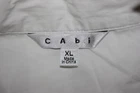 Welcome to Pim's clothing sales Very nice condition lightweight top. Solid white. Crisp fabric. Hidden button front. Integrated belt. Brand: Cabi Material: 75% Cotton 22% Nylon 3% Spandex Size : XL Tagged - see measurements below Bust: 23 armpit to armpit Waist: 20 Shoulders: 16 Length: 27 shoulder to hem (Ask if you need more measurements) Please Remember all Clothing Items may fit differently depending on Brand, Fit, Use or Prior customization. We strongly urge our customers to check measurements first to guarantee proper fitting. Please be sure to check out our listings frequently for more high quality Designer Brand clothing items at a fraction of the price. We are getting new inventory all the time! You never know what amazing deals you may find :) Shipping discounts will be provided for multiple purchases - Please contact us after multiple purchases for an updated invoice.