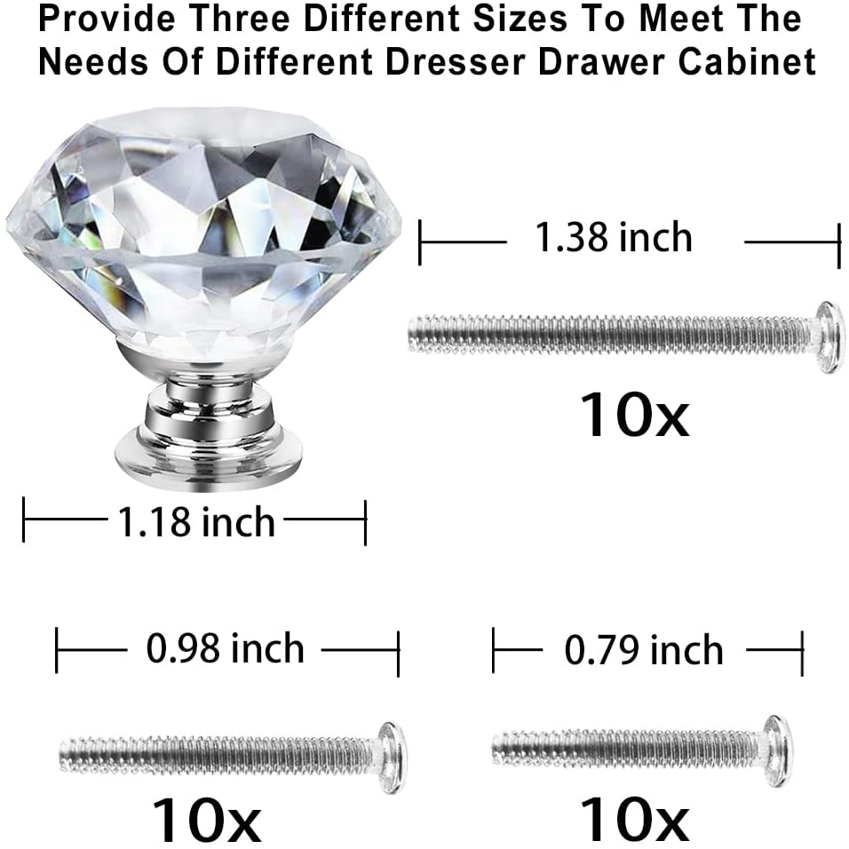 Glass Diamond Knobs Material: crystal cabinet Knobs Diamond knobs 30mm,sturdy and easy to install Crystal Knobs for Cabinets and Drawers, Bathroom Cabinet, Office for Dresser Knobs 10 Pack 1.18inch(30mm) Pulls Size: Cabinet knobs includes three sizes of screws prepared for different cabinet, drawer, dresser, cupboard, wardrobe furniture door and more. ( 0.79 inch&0.98 inch&1.38 inch ) Screws are available to make the kitchen knobs suitable for any. Clear Glass desing: cabinet pull dresser knobs drawer knobs very nice, Perfect decoration and beautiful addition for your home, office, kitchen, bathroom, living-room, bedroom. Our package: 10 pcs Crystal knobs and 10 pcs Three types of Screws(0.79 inch & 0.98 inch & 1.38 inch). Please make sure that the thickness of your cabinet is matched with the three kinds of screw length we provide, otherwise you will need to purchase additional screws of other length for your own cabinets. Our Service: If you're upgrading or replacing cabinets,cupboard,drawer, our crystal knobs for drawers will give you new feeling.You have any question about glass cabinet knobs handles ,please contact us. We 'll solve for you as soon as possible. Product Description No matter what style you like, our cabinet knobs are suitable for all kinds of furniture decoration styles. Modern, rustic or Chinese style perfectly complements your knob decoration. Your can use it in the living room, cabinet, bathroom, bedroom, kitchen, bookcase and dresser drawer. Wide range use place can meet your needs. The knobs and pull handle is made entirely of real glass and zinc alloy. Shiny appearance enhances your life's enjoyment.