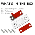 Ultra Thin Design: Our magnetic cabinet catch total thickness is only 1/7 inch, the magnetic force is 10 lbs, can be used for cabinet doors ,slidingdoors,drawers,lid,Windows and shutters closure. Super Suction: The cabinet door magnets is strong enough to stay cabinet shut, suitable for using on the door which the latch or hinge is useless. Long-Lasting: You don't need worry about the screw will easily broken on installation process again,These flat magnets for cabinets are made of metal material, cracking, long lasting than the plastic one. Easy To Install: Before installation, the cabinet door should be cleaned first, and then there is no need to drill and screw in the screw holes thus protecting the cabinet door from damage.Tips: Wait for 30 minutes, after the magnetic door latch was sticked. Suitable Range -What You Get:The kitchen cabinet catch can be used for Cabinet doors, Windows Shutters, Sliding Doors, Lid,Medicine-Cabinet,Drawers,duette blinds closed and more. You Get:5 x Cabinet Magnets Catch; 20 x Screws; 10 x Double-sided Adhesive.