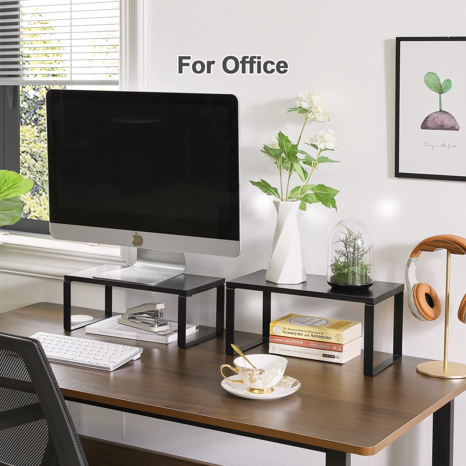 Elevate your space with our Cabinet Shelf Organizer, a versatile and sturdy storage solution designed to maximize your countertop, cabinet, or pantry space. This set of 2 stackable, metal and MDF shelves boasts a durable, matte black finish that complements any home decor style. Each shelf can support up to 33 lbs, providing ample space for spices, cans, cups, or office supplies. With dimensions of 13.4 x 7.1 x 6.3 inches for the larger shelf and 13.4 x 6.7 x 5.1 inches for the smaller one, they fit perfectly in most cabinets and countertops. Easy to assemble with included screws, these organizers can be stacked, nested, or placed in an L-shape to suit your unique space. Wipe clean with a dry cloth for simple maintenance. PLACE IN MULTI-WAYS: Stack them, nest them, separate them, or place them in an L shape to fit your space. It is up to you. Just find your way, customize your storage, and maximize your space STURDY MATERIAL : Designed with a strong metal frame, these cabinet shelf organizers supporting up to 33 lb per shelf. Big size: 13.4*7.1*6.3 inches, Small size: 13.4*6.7*5.1 inches SPACE SAVING: The counter shelves will help create a well-organized countertop that you can easily find the right spice while cooking. Also fit for sorts of cans and cups in the cabinet. Put it in the office or bathroom for easy storage of office supplies or toiletries SIMPLE DESIGN: Featuring matte black frame and MDF particleboard, retro colors and minimalist design fit any home decor style.Bring some unique color to your home EASY ASSEMBLY: Only need to install a few screws and you will get storage racks within a few minutes. All screws and accessories come with the package