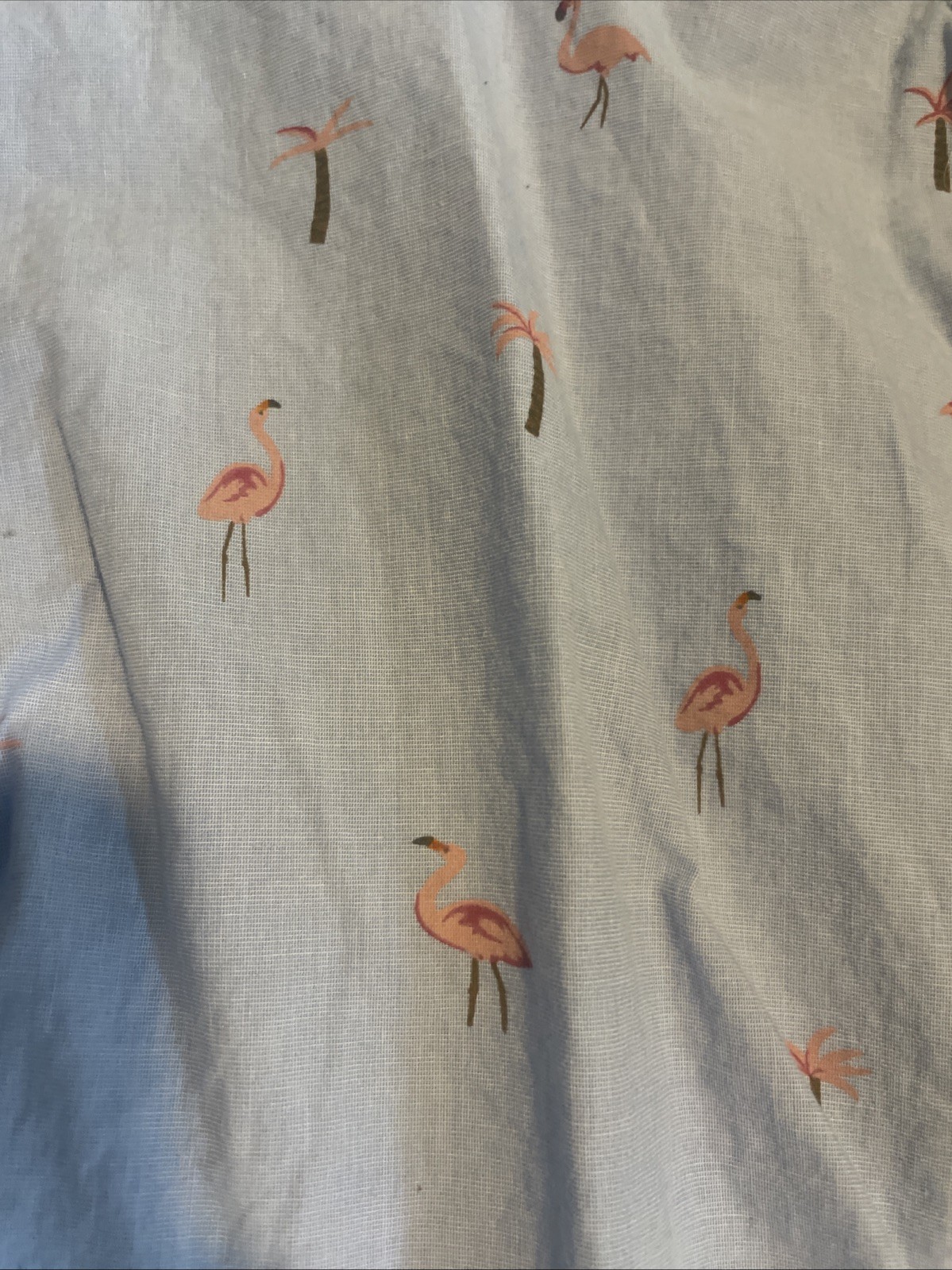 The product is a Cactus Man Ricky Singh button front shirt in blue with a pink flamingo print, featuring a tropical pattern. This shirt is designed for men, with a regular size medium and short sleeves. The collar style is a button-down, making it a casual and stylish option for a comfortable and trendy look.