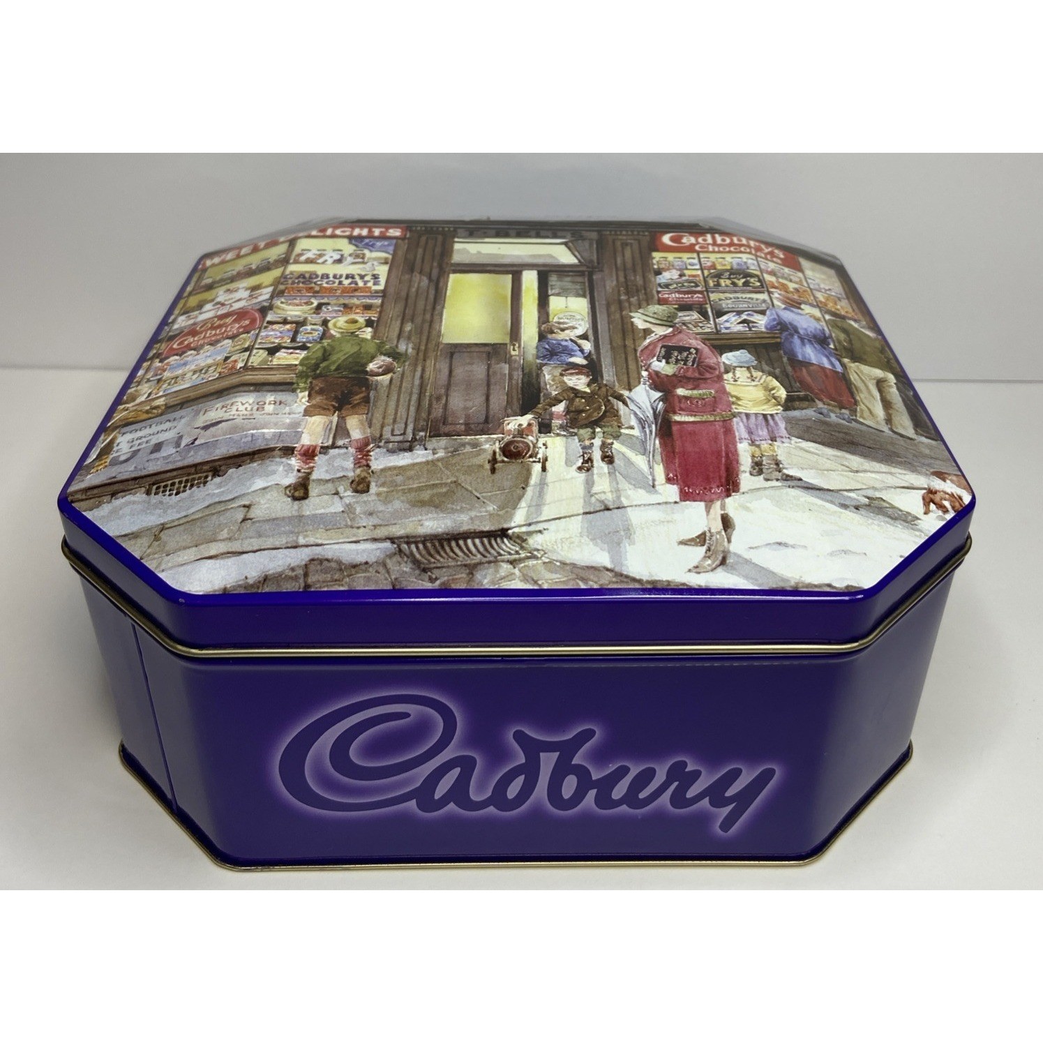 The Cadbury Tin Chocolate Holidays Christmas "Vintage Sweet Shop" is a festive and nostalgic collectible featuring a multi-color design. This tin, bearing the iconic Cadbury brand, is perfect for storing holiday treats or serving as a decorative piece during the Christmas season. With a charming vintage feel, this tin brings a touch of old-world sweetness to any space, making it a delightful addition to any collector's display.( Tin is empty)