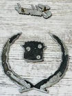 All of the emblems are pre-owned or used. They will need the tape removed from the back and a good polish. One wreath only has one pin and is missing 2 pins. The last 2 photo's show the eight item.