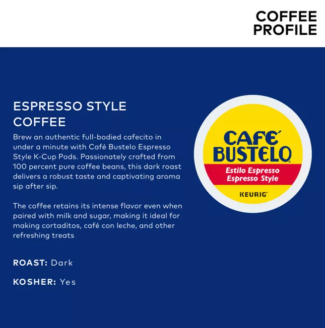 The Cafe Bustelo Espresso Style Coffee Keurig K-Cup Pods in Dark Roast offer a rich and flavorful espresso experience, with each pod containing less than 50 calories per serving. These Kosher-certified coffee pods are compatible with Keurig machines, making it easy to enjoy a delicious cup of dark roast coffee at home. The 24-count box provides an ample supply of convenient and customizable servings, perfect for coffee lovers looking for a bold and satisfying brew.