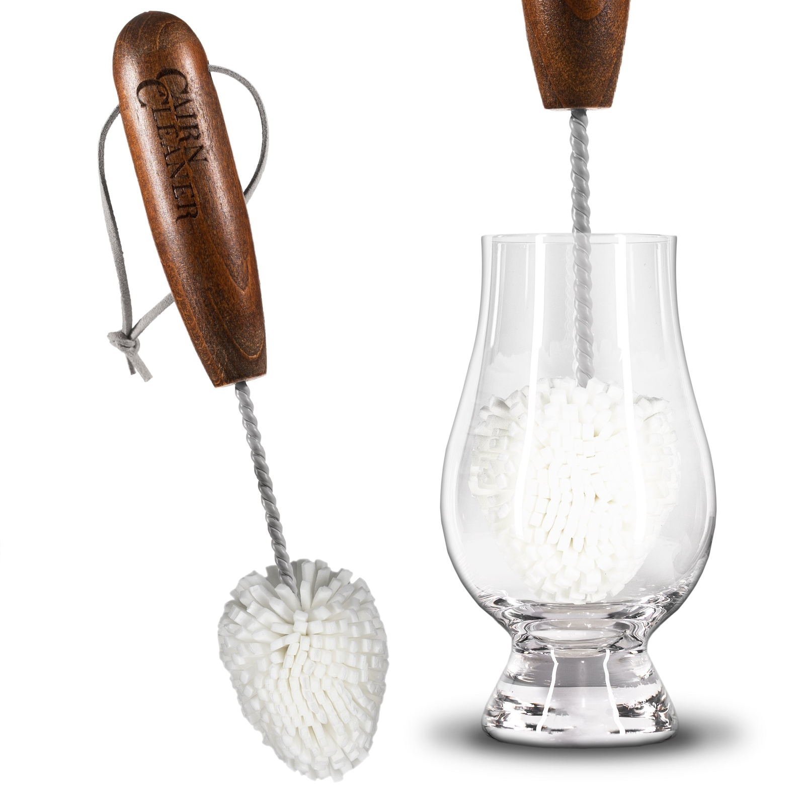 We've added a new Dark Hardwood handle version of our best-selling CairnCleaner that includes a light grey leather loop and wire coating. Small, pointed brush head with a longer reach for the deepest crevices in your whiskey tasting glasses and other drinkware. Sealed hardwood handle for long-term durability, and coated steel construction for scratch-free cleaning. Natural light-grey leather loop for hanging and drying. Satisfaction Guaranteed - Don't like it? Drop us a line and we'll make it right. Designed for glassware that is elusively-difficult to clean, the CairnCleaner was designed to scrub out the residue at the very bottom of a whiskey, wine, or beer glass. Did you leave out a couple glasses just a little too long after an evening tasting event? With a scratch-free brush head, the CairnCleaner will get down into the lowest point of your glasses to make sure the next time around starts off with crystal clear glassware. Also excellent for water bottles and other items around the kitchen that would otherwise be relegated to a quick spray-down due to their deep reach.