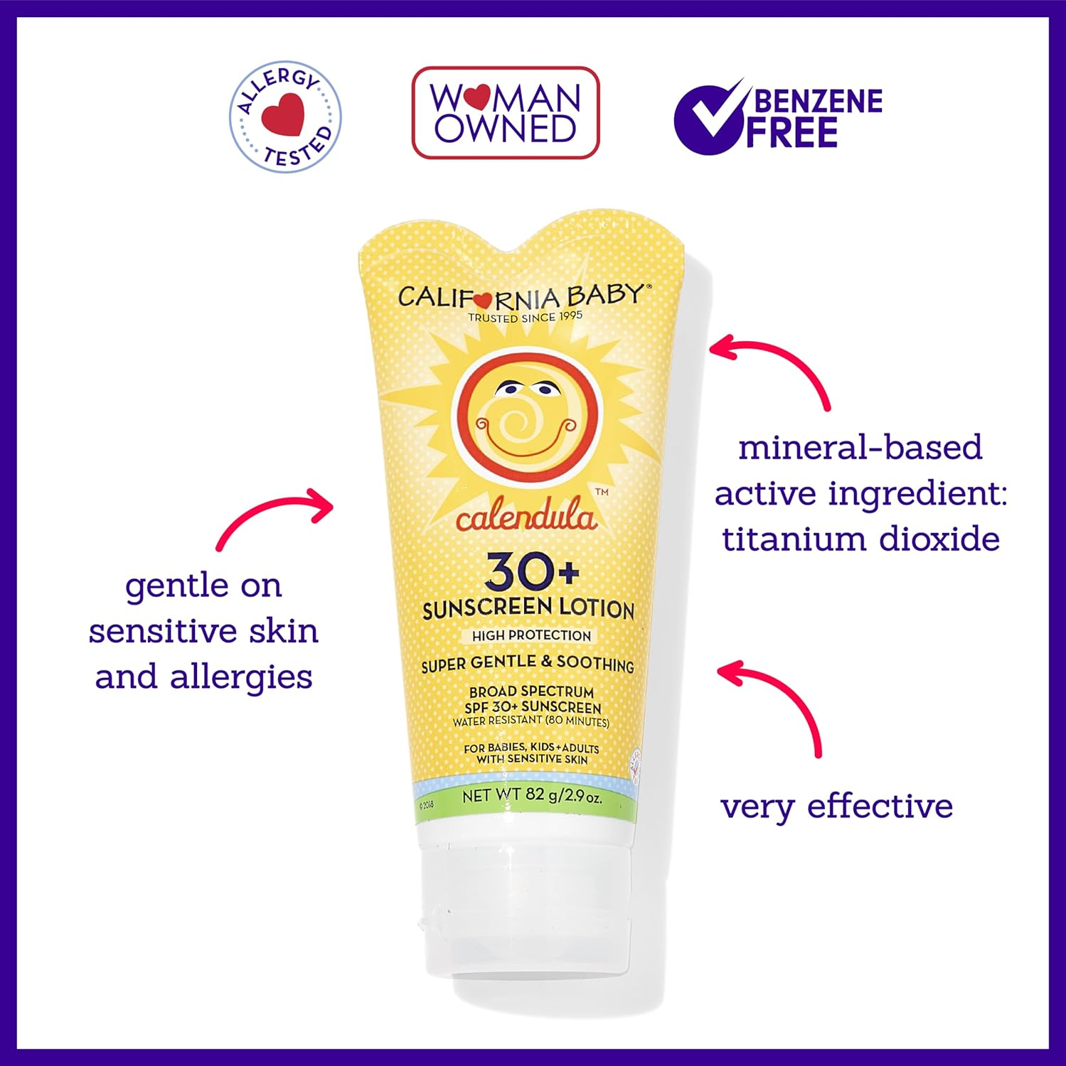 VERY EFFECTIVE, BROAD SPECTRUM KIDS SUNSCREEN: Our sensitive skin sunscreen blocks both UVA + UVB rays and is water resistant for up to 80 minutes. California Baby sunblock is highly rated by Consumer Reports for effectiveness. MINERAL SUNSCREEN: The active ingredient is Titanium Dioxide (non-nano). Our gentle + effective sun screen is highly rated by EWG for ingredient safety. This toddler sunscreen is free of toxic ingredients like oxybenzone and homosalate. If traveling to Hawaii, choose this reef safe sunscreen travel size. BEST SUNSCREEN FOR SENSITIVE SKIN: This body + face sunscreen is not absorbed into the bloodstream like traditional chemical sun block. Our non-toxic sunscreen is non-invasive and pediatrician recommended for baby sunscreen 6-12 months and older. LIGHT LAVENDER SCENT: No synthetic fragrances - our multi-award-winning sunscreen lotion is now lightly scented with French lavender and clary sage pure essential oils. You can use our benzene free sunscreen from head-to-toe, including as a facial sunscreen and body sunscreen. HYPOALLERGENIC SUNSCREEN: This hypoallergenic sunscreen for sensitive skin is allergy tested + free of common allergens like gluten, soy, sesame, oat, dairy, peanuts, and tree nuts (except coconut). No risk of cross contamination – our reef safe sunscreen spf 30 is ideal for babies with allergies. Product description The video showcases the product in use. The video guides you through product setup. The video compares multiple products. The video shows the product being unpacked. 1 Free of Common Allergens 2 Application Tips 3 Free of Harsh Chemicals 4 Tips For Use 5 Chemical vs. Mineral SPF The video showcases the product in use. The video guides you through product setup. The video compares multiple products. The video shows the product being unpacked. What is the active ingredient? Active ingredient: (non-nano) Titanium Dioxide 12%. Does this sunscreen absorb into the body? Unlike chemical sunscreens, our mineral-based sunscreen DOES NOT absorb into the skin or bloodstream. Our sunscreen sits on top of the skin, acting as a physical barrier and scattering and reflecting UVA and UVB rays. Is this sunscreen coral reef safe? Yes! California Baby sunscreens are reef safe. Our mineral-based active ingredient, Titanium Dioxide, does not damage marine life. What is your allergy statement? This product is free of gluten, soy, oat, sesame, dairy, and nut ingredients (except coconut). Because we make our own products there is no risk of cross-contamination involving tree nuts, peanut, egg, milk, soy, wheat, pea, or nightshades. Which ages can use this product? Safe for babies 6 months and up!