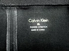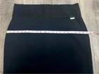 The Calvin Klein Black Power Stretch Pencil Skirt in size XL features a wide waistband and is made of a blend of nylon, spandex, and rayon, providing a stretchy and comfortable fit. This sleek and straight skirt is perfect for various occasions including business meetings, weddings, and casual outings, with its knee-length design making it versatile for all seasons. The black color and solid pattern, along with the Calvin Klein logo accents, add a touch of sophistication to this wardrobe essential.