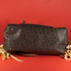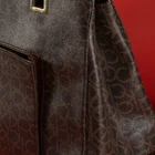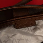 The Calvin Klein Logo Signature Tote Bag in blush pink features a stylish monogram pattern with double handles, making it a fashionable and practical accessory for women. Made of leather with a brown exterior, this tote bag has a width of 14 inches, height of 12 inches, and depth of 8 inches, providing ample space for all your essentials. The iconic Calvin Klein brand adds a touch of luxury to this chic handbag, perfect for everyday use or special occasions.