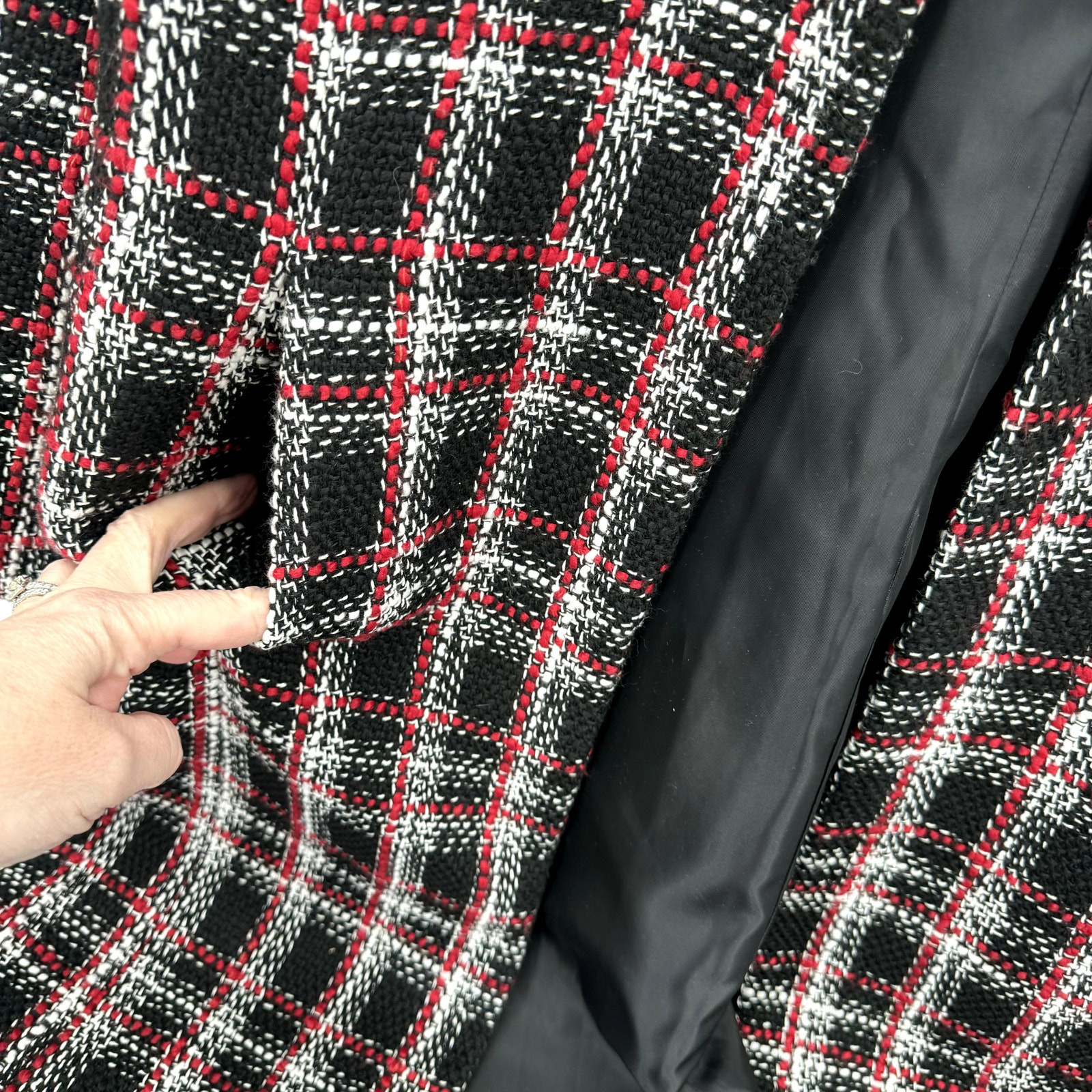 Calvin Klein Jacket Womens 10 Open Tweed Long Duster Black Red Plaid + Pockets Very good condition, FUZZY TWEED KNIT, see all pictures for views. I am 5'10, this comes down to my knees. •Pit to pit: 20" •Shoulder to hem: 40" Ships out same day or next open postal day. Thank you for your purchase, we appreciate you!