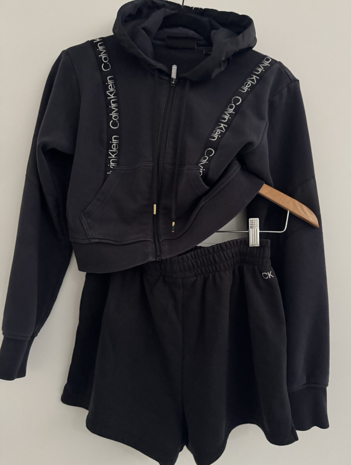 Calvin klein performance woman Calvin Klein Jeans Logo Piping Full Zip Sweatshirt and Matching Short in Black Size Small Woman cotton crop top hoodie & Short Set * side pocket black * Zip * Cotton This beautiful cotton set, purchased in Melbourne, Australia 🇦🇺 Condition: Used, in good condition The hoodie has been washed a few times, which has caused a slight colour difference between the top and shorts.