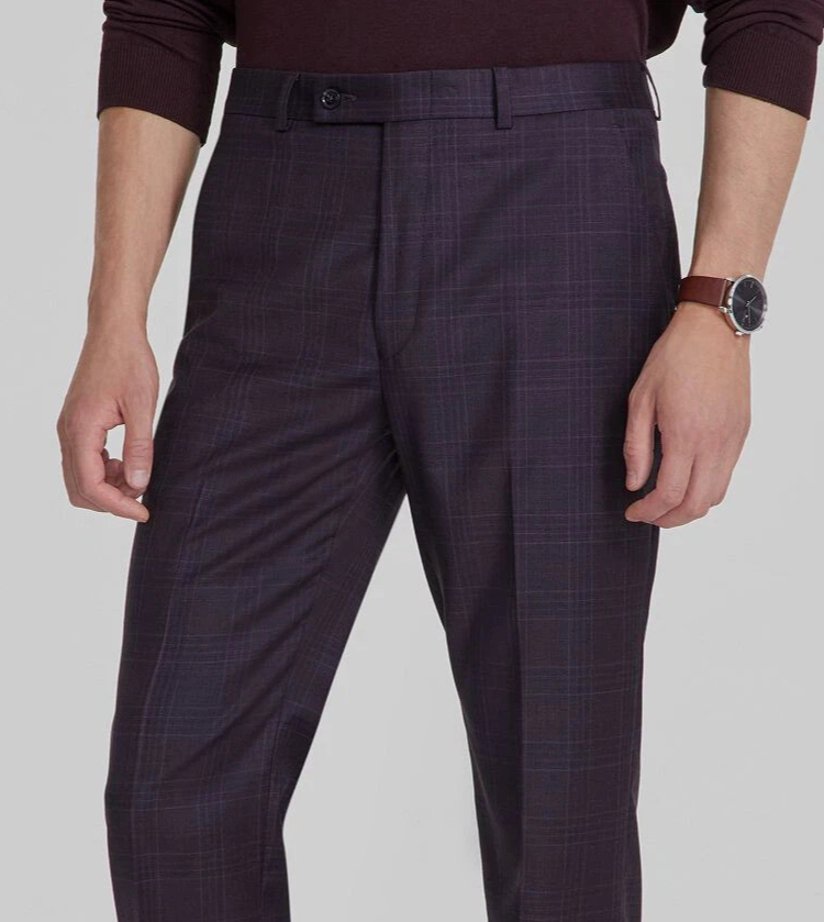 The Calvin Klein Men's Slim-Fit Wool-Blend Stretch Plaid Suit Separate Pant is a sophisticated and stylish addition to any man's wardrobe. Made from a high-quality wool blend with a stretch for added comfort, these pants feature a slim fit and straight leg design. The navy/burgundy plaid pattern adds a touch of preppy elegance, making them perfect for formal events, city outings, or even weddings. With a zipper closure and flat front, these pants offer a sleek and modern look for the contemporary gentleman.