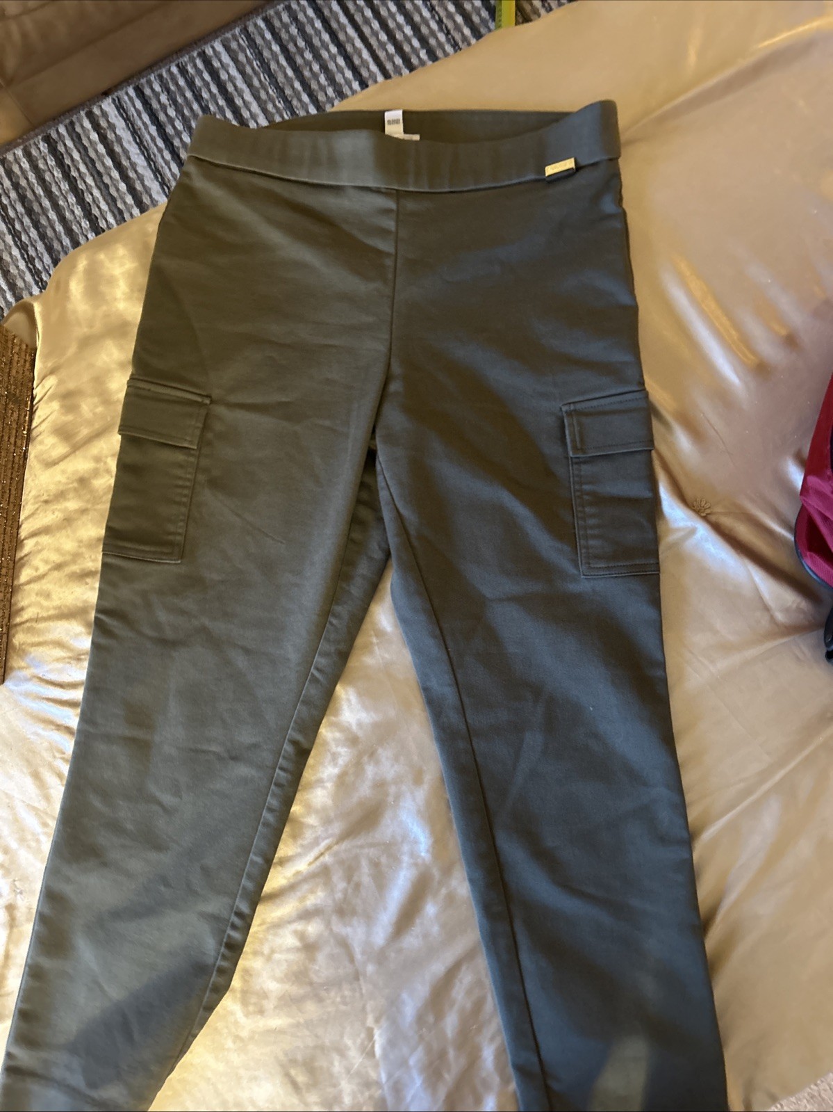 The Calvin Klein Mid Rise Crop Capri Cargo Stretch Olive pants in size Large for women are a stylish and versatile addition to any wardrobe. Made from a comfortable cotton blend fabric with a stretch feature, these pants offer a pull-on closure and a mid-rise fit. The olive green color and logo accents give them a trendy and classic look, perfect for casual occasions year-round. With straight leg style and pockets for added convenience, these pants are designed for everyday wear and easy care with machine washable instructions. Perfect for the fashion-forward woman looking for a chic and comfortable option.