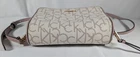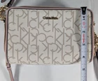 This Calvin Klein crossbody bag offers modern elegance with a classic touch. Featuring the signature CK monogram print in beige, accented with blush pink trim and gold-tone hardware, this compact yet functional bag is perfect for everyday use or casual outings.Item Details:Brand: Calvin KleinColor: Beige / Blush PinkMaterial: Coated Canvas with Faux Leather TrimHardware: Gold-ToneClosure: Dual Top Zip CompartmentsInterior:Signature CK logo liningOne zip pocketOne slip pocketStrap: Adjustable crossbody strap with chain detailApprox. Dimensions: 8" L x 5" H x 2.5" DStyle: Crossbody / Shoulder BagFeatures: Lightweight, durable, and easy to cleanCondition:Pre-owned, excellent condition. Interior is clean and free of stains. Exterior shows minimal signs of wear — very well maintained. Zippers glide smoothly, hardware shiny and intact. From a smoke-free, pet-free home.