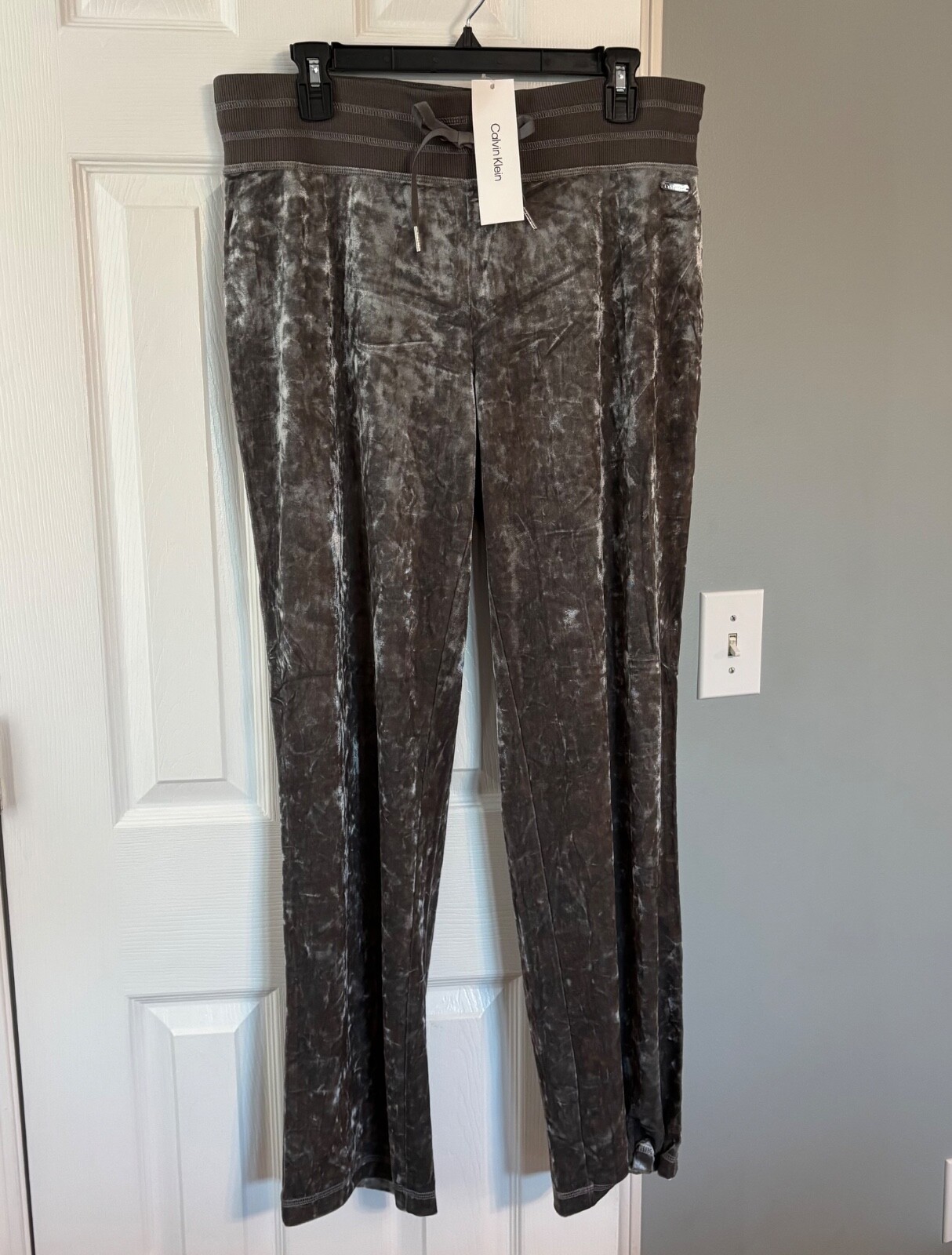 Calvin Klein Silver Wide Leg Pants Size: M New with tag Soft, comfortable Velour/velvet Drawstring with elastic waist Logo near hip
