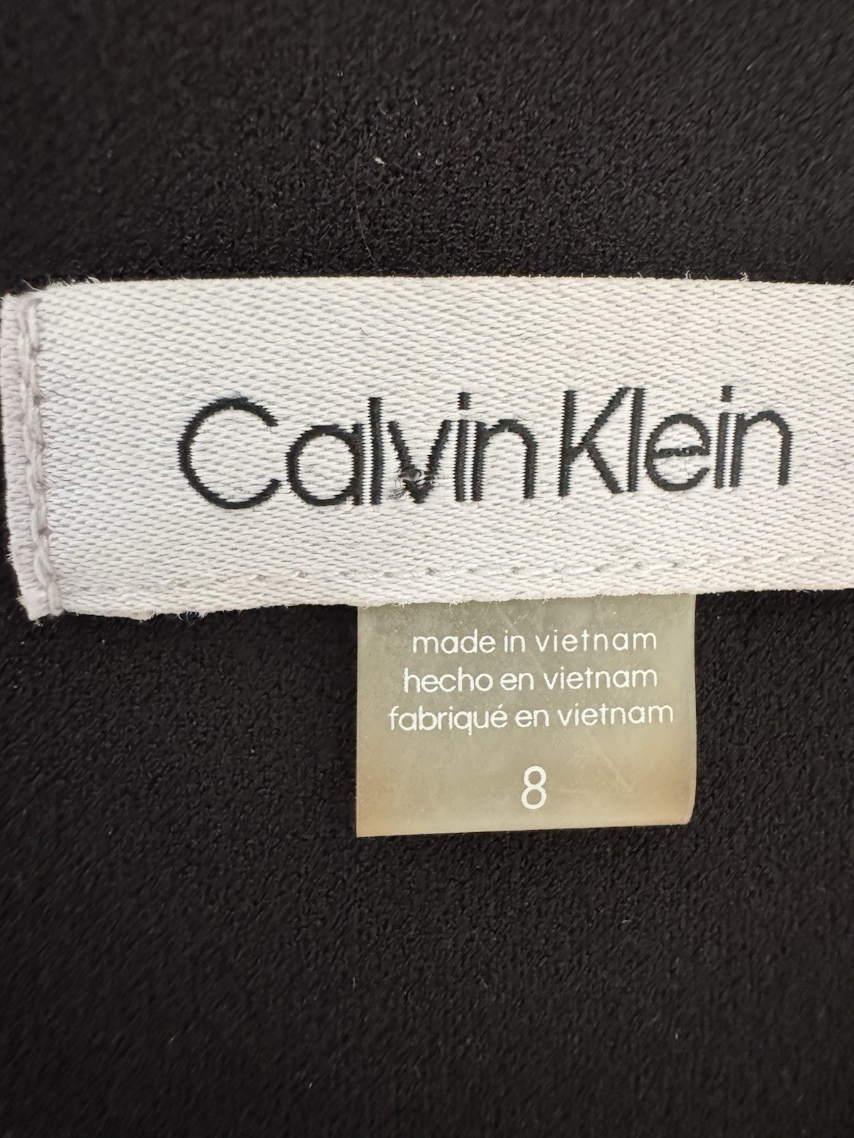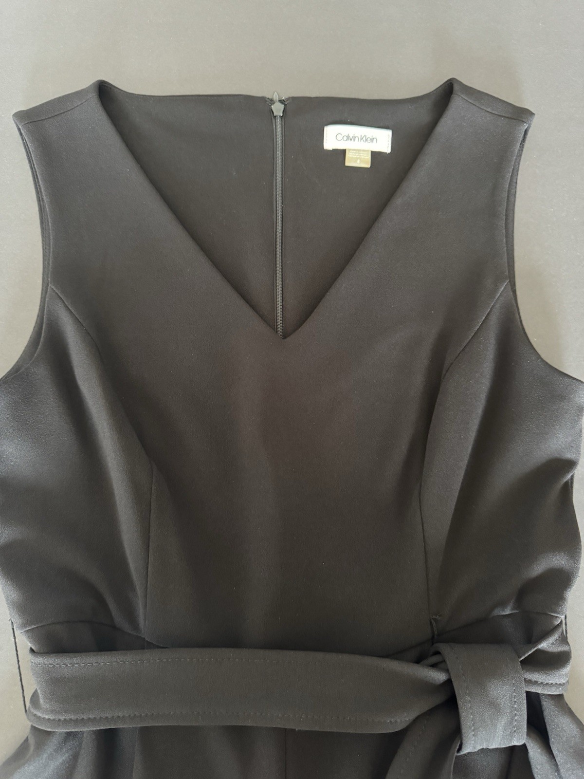 Chic and timeless black sleeveless jumpsuit by Calvin Klein, featuring a flattering V-neckline, waist tie belt, and wide-leg cropped fit that enhances the silhouette with modern sophistication. • Brand: Calvin Klein • Size: 8 • Color: Black • Material: 94% Polyester, 6% Spandex – smooth, slightly stretchy fabric for comfort and shape retention • Closure: Back zipper • Features: • Wide-leg cropped style • Self-tie waist belt • Side pockets • Fully lined • Mid-to-high waist fit • Condition: Excellent pre-owned condition; clean and well-maintained • Care: Dry clean only • Made in: Vietnam • RN#: 54163 • Style Code: CDOC12P2 / CDSNOW4091 BLK Perfect for work, evening events, or a polished day look — pair it with heels and a clutch for a refined outfit.