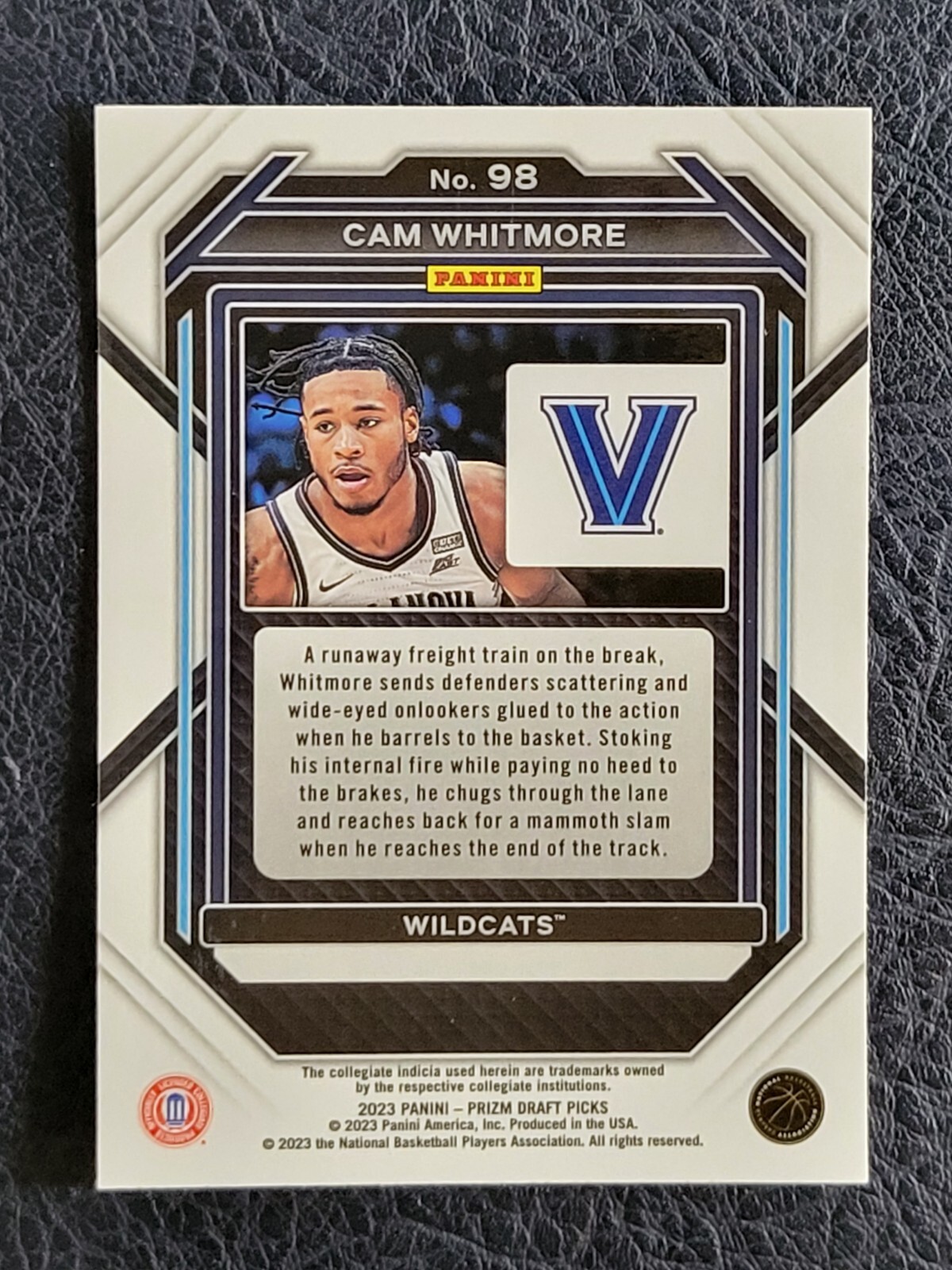 Cam Whitmore 2023-24 Phoenix Instant Impact Rookie & Prizm Draft 98 Rockets RC is a set of two standard-sized sports trading cards featuring Cam Whitmore from the Houston Rockets and Villanova Wildcats. The cards are part of the 2023 Panini Prizm Draft Picks and 2023-24 Panini Phoenix sets, showcasing Whitmore as a rookie player. The cards are made of card stock and include base set and insert features, perfect for basketball fans collecting NBA memorabilia.