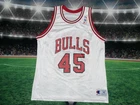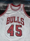Nice and clean The product is a vintage Champion jersey of Michael Jordan from his time playing for the Chicago Bulls, specifically featuring the number 45. This basketball jersey is white in color and comes in a size 48. It is an authentic NBA item, made in the United States, and is a coveted piece for fans and collectors alike. The jersey represents a piece of basketball history, as it is associated with one of the greatest players in the sport and a legendary team in the NBA.